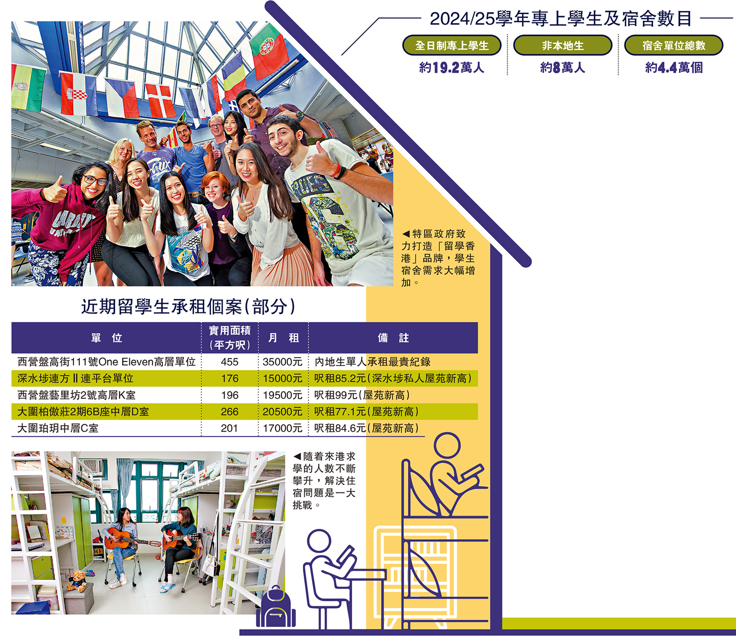 (大公報記者 湯嘉平、江凌風)香港特區政府近年積極推廣「留學香港」品牌,致力打造國際教育樞紐,去年施政報告提出推出先導計劃,在規劃、地政、建築圖則審批方面拆牆鬆綁,鼓勵市場以自資和私營方式改裝酒店和其他商廈,增加學生宿舍供應。隨着來港求學的人數不斷攀升,住宿問題仍是一大挑戰。