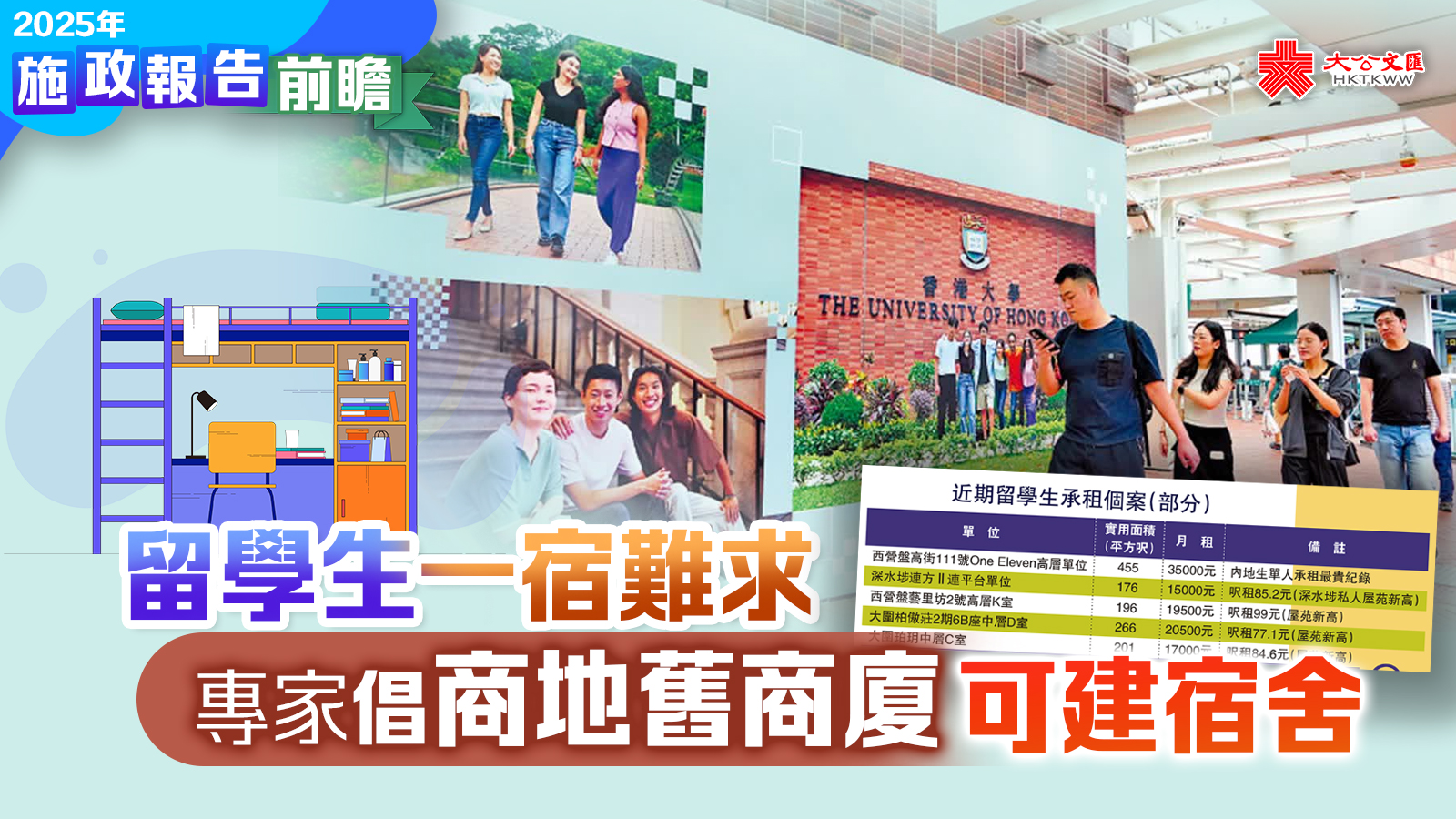 新一份施政報告公布在即,有專家指出,大學宿位是吸引留學生來港的關鍵因素,建議進一步拆牆鬆綁,容許商業用地、舊商廈重建作學生宿舍,免卻冗長的規劃及改契補地價程序,既讓業主及發展商多一個發展選擇,又可解決學生宿舍的「一宿難求」的痛點。