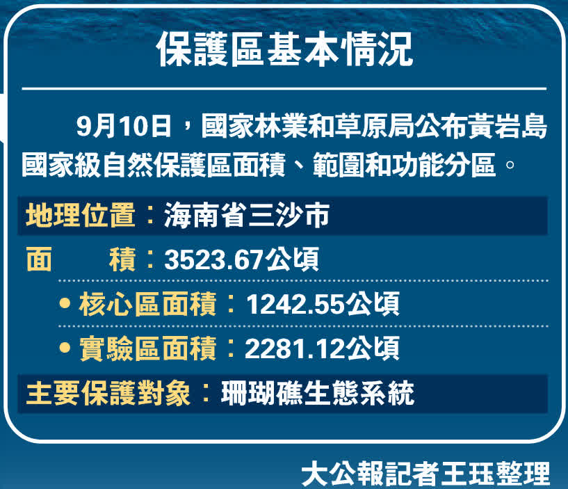 批覆指出,黃岩島國家級自然保護區的面積、範圍和功能分區等由國家林草局另行公布。