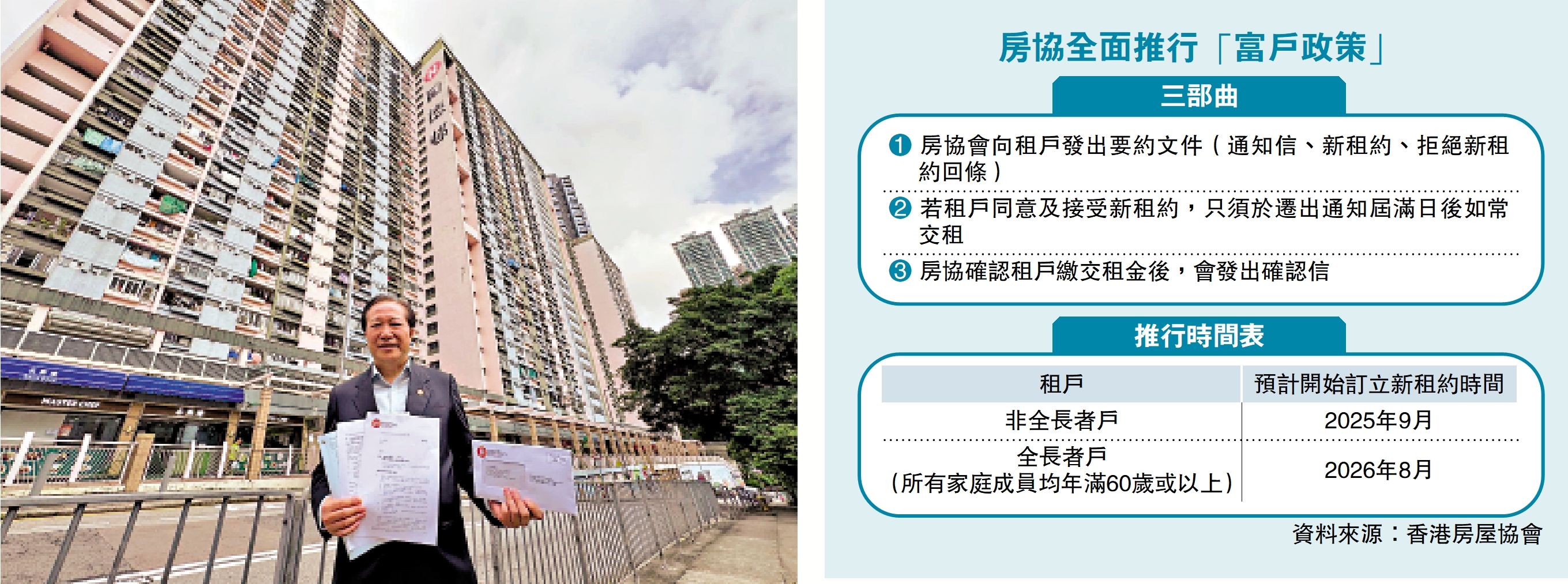 房協轄下有3萬多個出租公屋單位,2018年開始推行富戶政策,但至今只有約5100戶的租約已納入富戶條款。房協總監(物業管理)潘源舫接受訪問時表示,為統一租戶管理,以及更有效善用公屋資源,房協將透過簡易程序,以「換新租約、毋須簽署、如常交租」形式,分階段將富戶政策擴展至2.5萬個未受涵蓋租戶,預計明年底前完成更換所有租約。所有家庭成員均為60歲或以上的全長者戶,會安排在最後一批換新租約,預計明年第三季更換租約。