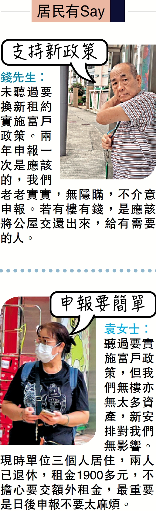 新租約與舊租約有何不同?潘源舫表示,房協現時與租戶的租約,最早可追溯至1964年,其後陸續有新屋邨落成,租約內容亦有差異,新租約除了加入富戶政策條款,亦會補充隨社會發展需要而新增的條款,例如允許有需要的租戶可以申請飼養小型寵物;為配合申報要求,會列明租戶須授權房協向第三方核實其收入、資產及居住情況等。