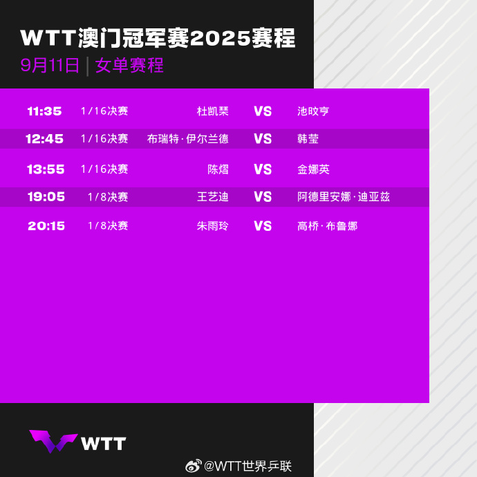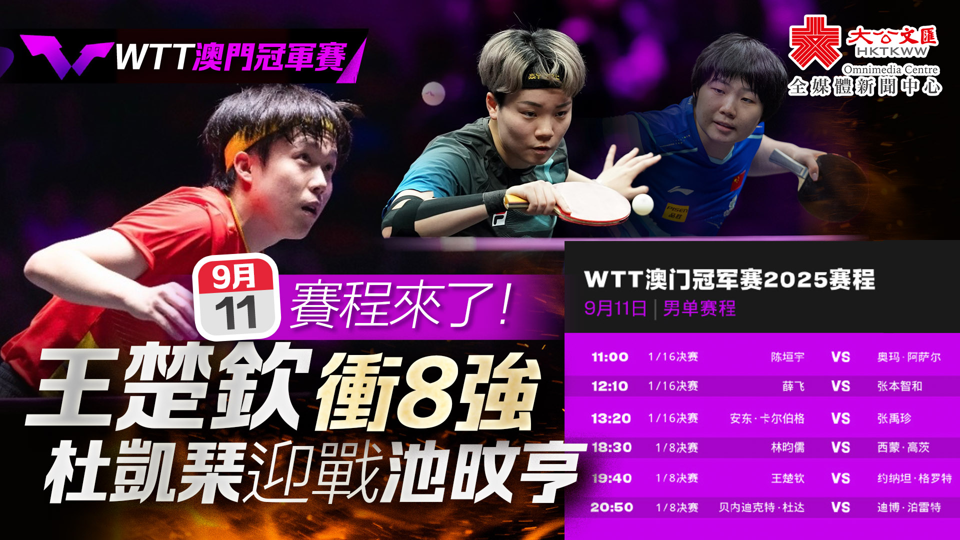 大公文匯全媒體報道,北京時間9月11日,WTT澳門冠軍賽將結束單打1/16決賽,產生所有的16強名單,同時開啟1/8決賽,比賽正式加速進程,向着高潮階段邁進。以下是今日(11日)的賽程安排,一起為選手加油。