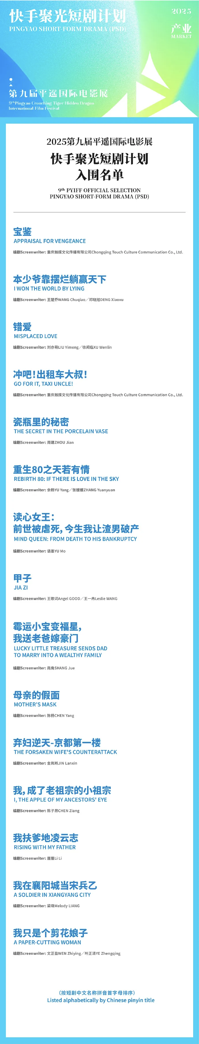 今年是平遙國際電影展首次將短劇納入參展範圍,對此「平遙國際電影展」官方微信公眾號在9月8日發文介紹稱,2025年,平遙國際電影展與短視頻平台快手旗下「磁力引擎」、精品短劇廠牌「快手星芒短劇」聯合發起,於產業板塊新設「快手聚光短劇計劃」。該計劃旨在搭建面向短劇市場的交流與合作平台,探索高質感短劇的創作可能性,共建優質短劇新標準,促進優秀內容走向市場、實現價值。經過多輪討論、評審與遴選,第九屆平遙國際電影展「快手聚光短劇計劃」入圍名單最終確定。