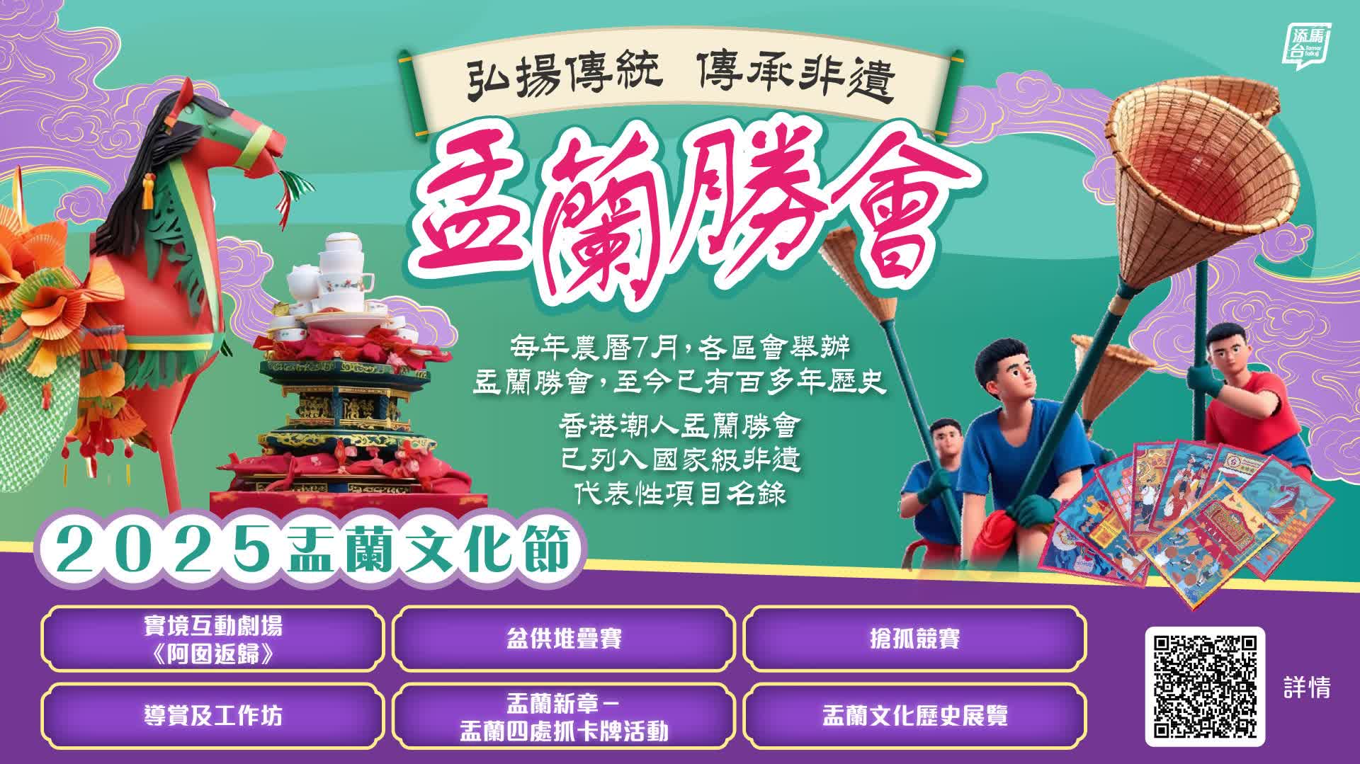 一年一度的「盂蘭文化節」,透過搶孤競賽、盆供堆疊賽、盂蘭文化歷史展覽等,介紹盂蘭勝會的傳統內涵和文化意義,今年更設有實境互動劇場《阿囡返歸》、「盂蘭新章」盂蘭四處抓卡牌活動等。看圖了解更多。