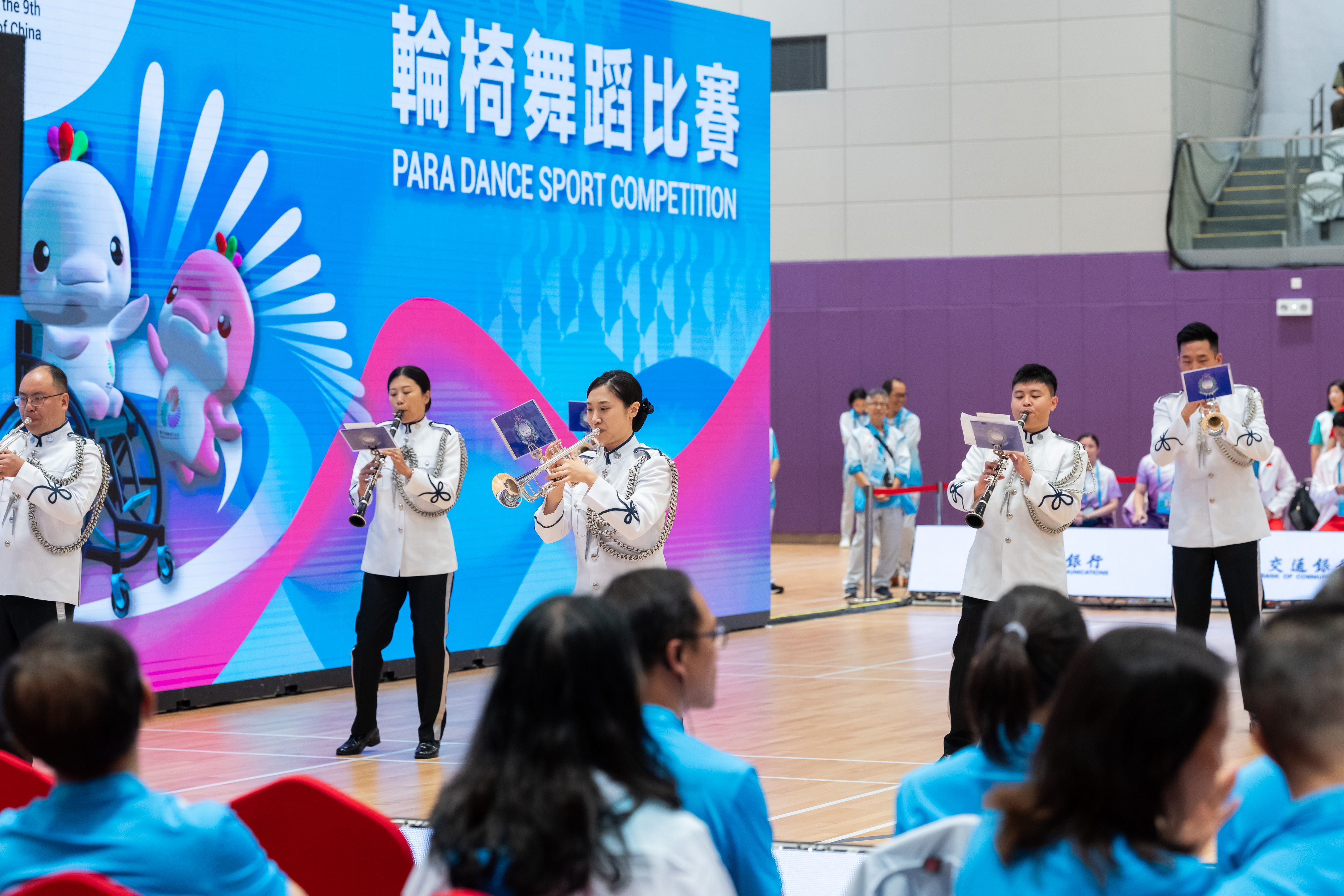 而入境處樂隊更獲邀為9月6日舉行的輪椅舞蹈群眾比賽作開幕暖場表演。他們亦是首支參與「十五運會」和「殘特奧會」表演的紀律部隊樂隊。當日,樂隊演奏了兩首動感舞曲《Y.M.C.A.》及《失戀》,並進行花式步操,拼出IMMD字樣,更和現場觀眾積極互動,為比賽揭開序幕。
