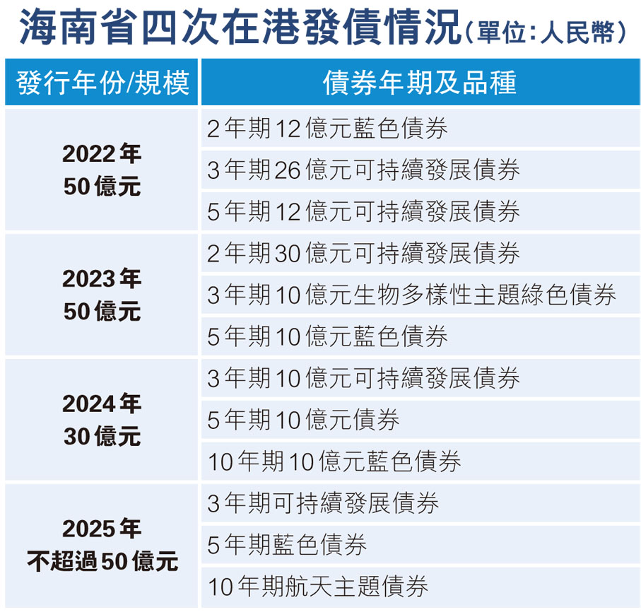 (大公文匯全媒體 記者 蔣夢宇)近年海南與香港兩地合作持續深化,金融領域合作成果尤為顯著。海南省政府本月將在香港發行離岸人民幣地方政府債券,規模不超過50億元(人民幣,下同),這是海南省連續第四年在香港發債,累計發債總額將達180億元。海南省委書記馮飛昨日在路演活動介紹,今次發行不僅保留廣受好評的3年期可持續發展債券及5年期藍色債券,亦首次推出10年期航天主題債券。這既是金融賦能海南重點產業發展、深化瓊港合作的重要舉措,也為投資者提供多元人民幣優質資產配置。