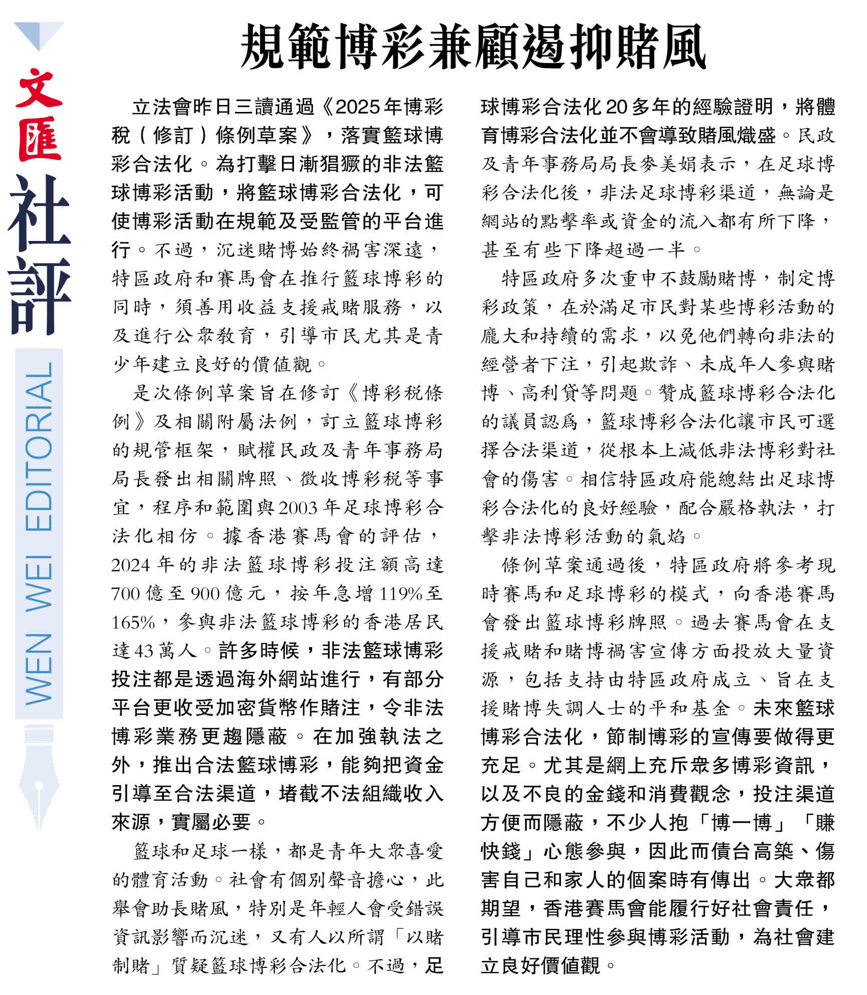 立法會昨日三讀通過《2025年博彩稅(修訂)條例草案》,落實籃球博彩合法化。為打擊日漸猖獗的非法籃球博彩活動,將籃球博彩合法化,可使博彩活動在規範及受監管的平台進行。不過,沉迷賭博始終禍害深遠,特區政府和賽馬會在推行籃球博彩的同時,須善用收益支援戒賭服務,以及進行公眾教育,引導市民尤其是青少年建立良好的價值觀。