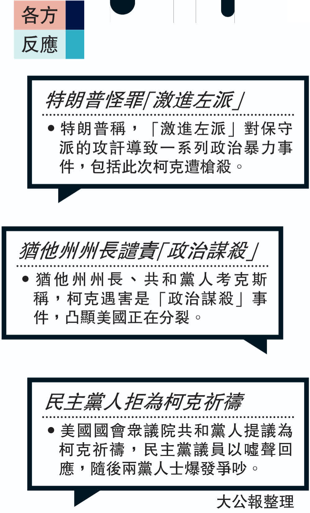 特朗普先下令全美降半旗誌哀,直至14日傍晚;後又宣布將為柯克追授總統自由勳章。他聲稱,柯克遇害是美國的「黑暗時刻」,並指責「激進左派」長期妖魔化不同政見者,導致美國出現恐怖襲擊與政治暴力。特朗普將柯克遇害與近年一系列針對共和黨人的襲擊事件相提並論,包括他自己遭遇未遂刺殺,但並未提到針對民主黨人的事件。猶他州州長考克斯稱,柯克遇害是「政治謀殺」事件,凸顯美國「正在分裂」。