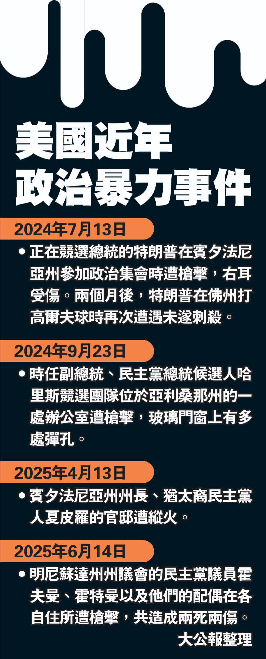政治暴力在美國已司空見慣。今年1月至6月,美國共發生約150宗出於政治動機的襲擊事件,幾乎是去年同期的兩倍。馬里蘭大學研究員詹森警告說,針對查理·柯克的槍擊案可能成為更多類似政治暴力事件的導火索。他表示:「美國正處於非常危險的境地。」