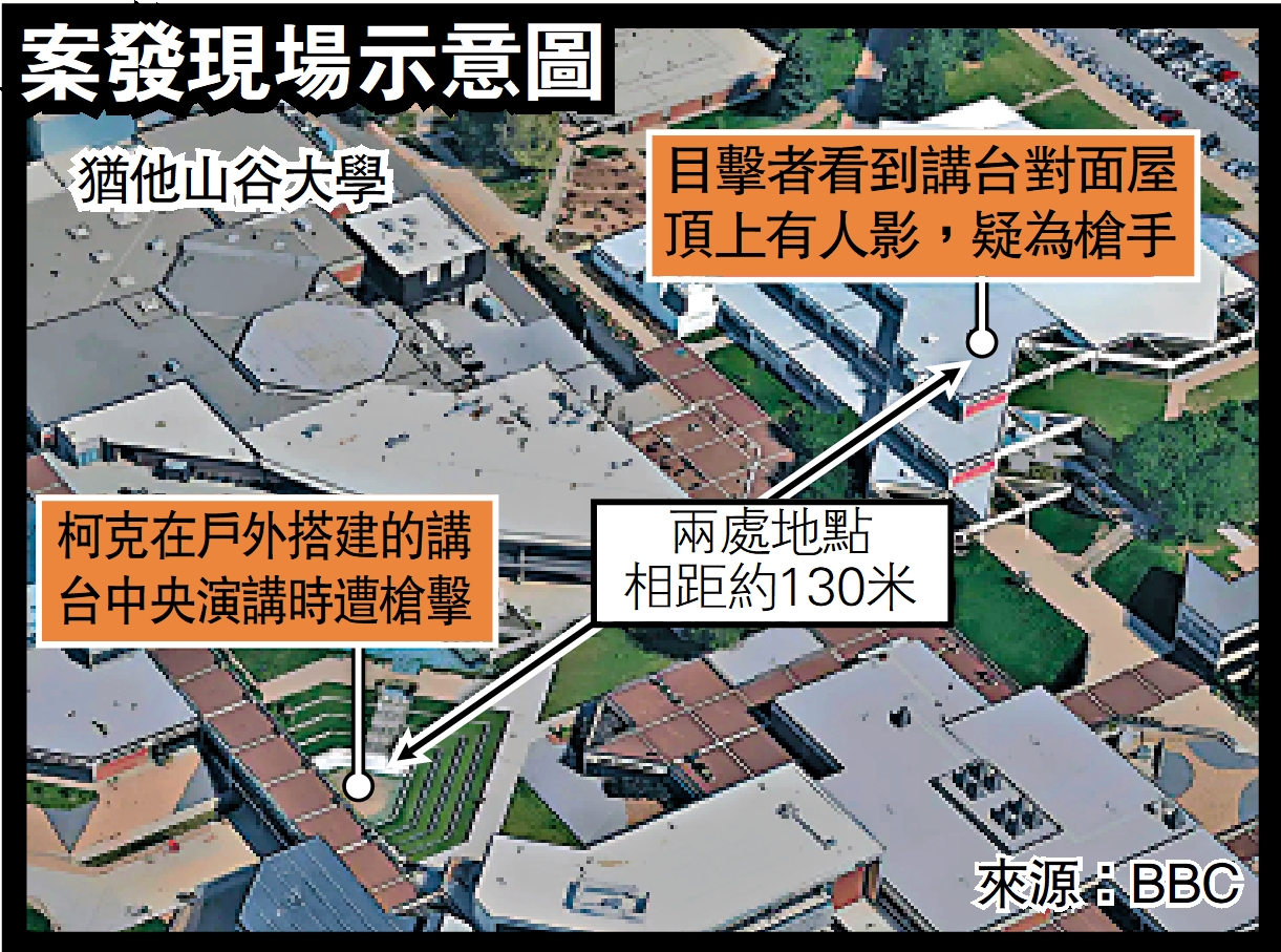 當地時間10日中午12時10分左右,柯克在猶他州奧勒姆市猶他山谷大學演講時遭槍殺。他原本計劃在全美作15場巡迴演講,猶他山谷大學的演講是第一場,吸引約3000人參加。現場視頻顯示,柯克坐在戶外搭建的講台中央,突然一聲槍響,他用手捂住脖子,鮮血噴湧而出,觀眾四散奔逃。另有視頻顯示,距離講台約130米的樓頂上有人影,且此人在槍響後迅速離開,疑為槍手。事發校園宣布11日至14日關閉,所有課程暫停。