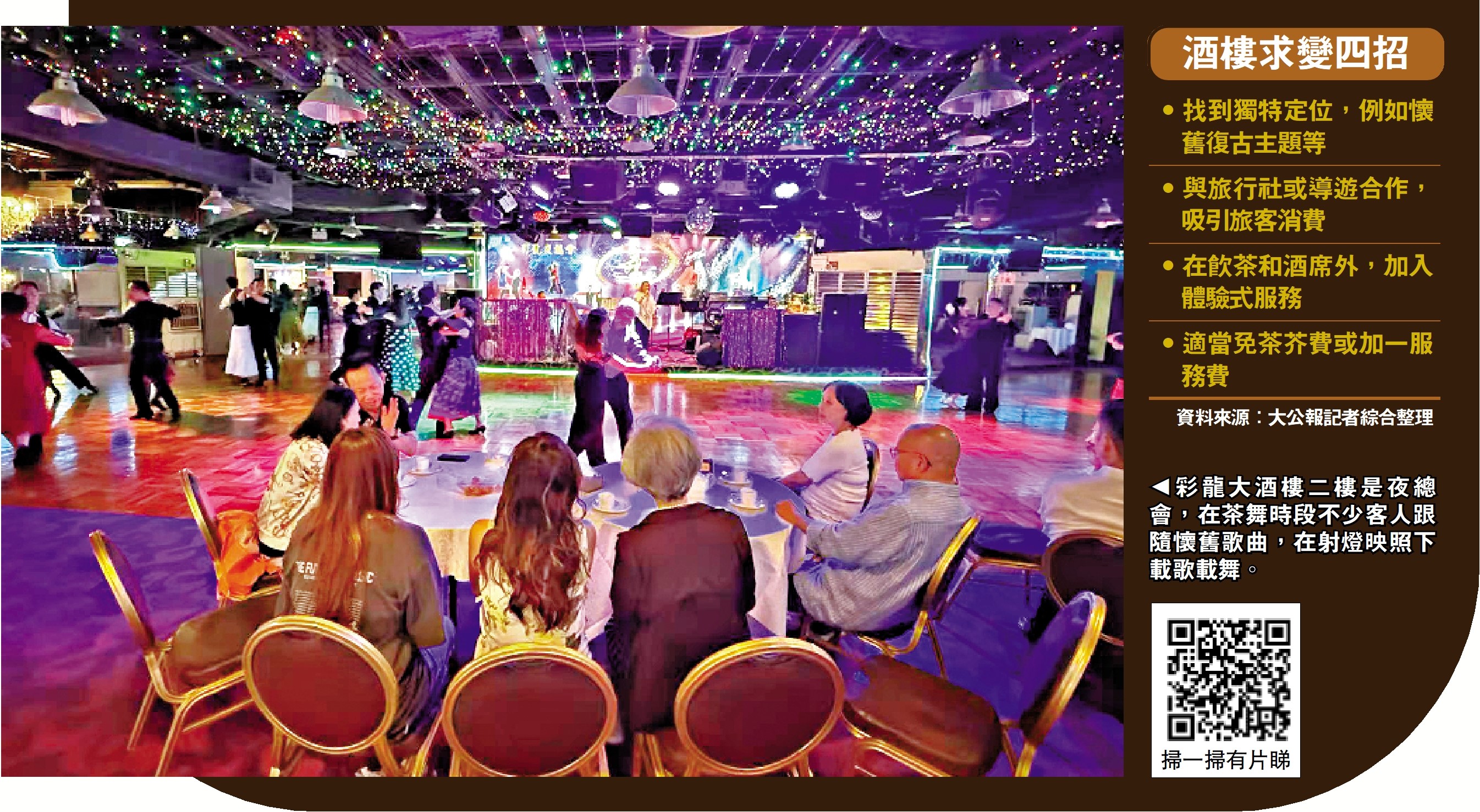 (大公報記者 王亞毛、賴振雄)本港傳統餐飲業近年持續萎縮,但仍有不少老字號酒樓經歷沙士、新冠疫情過後,因過去累積的一批忠實顧客(「忠粉」),仍然屹立不倒。有酒樓主打「人情味」,老闆以「尋找失去的青春」為定位,30多年來堅持每日奏樂伴茶舞晚舞,配合電商平台宣傳,吸引新舊顧客回味港式情懷。