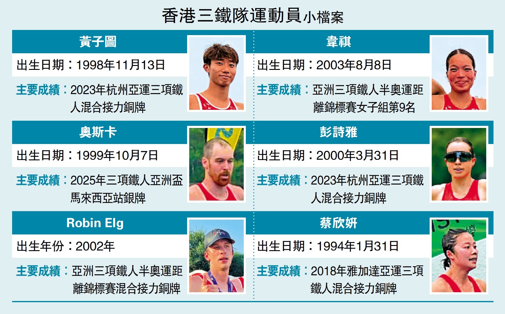 港隊曾在4月舉行的亞洲三項鐵人半奧運距離錦標賽香港2025作全運會資格賽,由於當時未有港將能夠躋身前五名,故未有人能直接取得全運會參賽資格。香港三鐵總會遂按準則選出6人的港隊名單,當中原籍法國的新星Robin Elg,4月時已透露於年初開始進行申領特區護照的程序,希望盡快歸化後爭取出戰全運會,結果他成功趕及領取特區護照而榜上有名,將與黃子圖及奧斯卡攜手出戰。