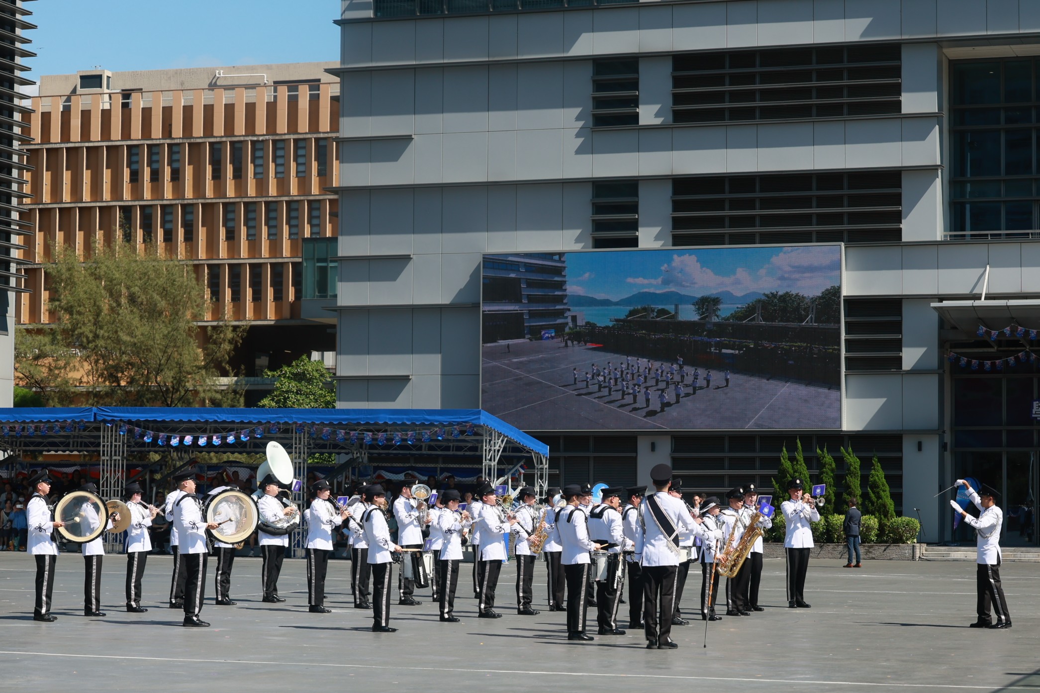 會操中,入境處樂隊演奏了新時代軍樂、愛國歌曲及經典金曲,儀仗隊則以花式步操拼砌出Skytrax獎項標誌,祝賀入境處榮獲Skytrax 2025年全球最佳機場出入境服務大獎,寓意入境處再創高峰。隨後會操隊伍以整齊的中式步操經過檢閱台接受檢閱,展示艱苦訓練的成果。