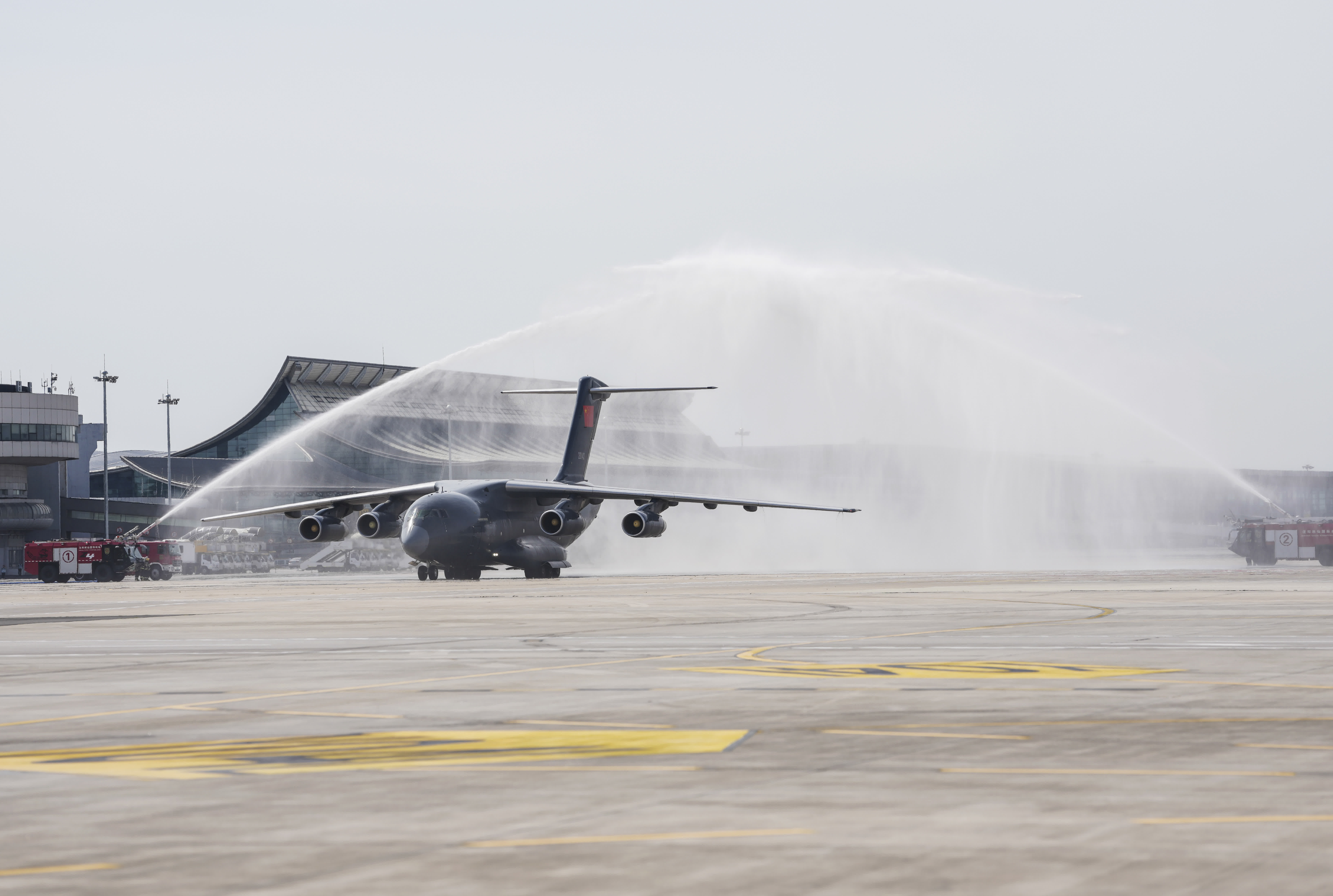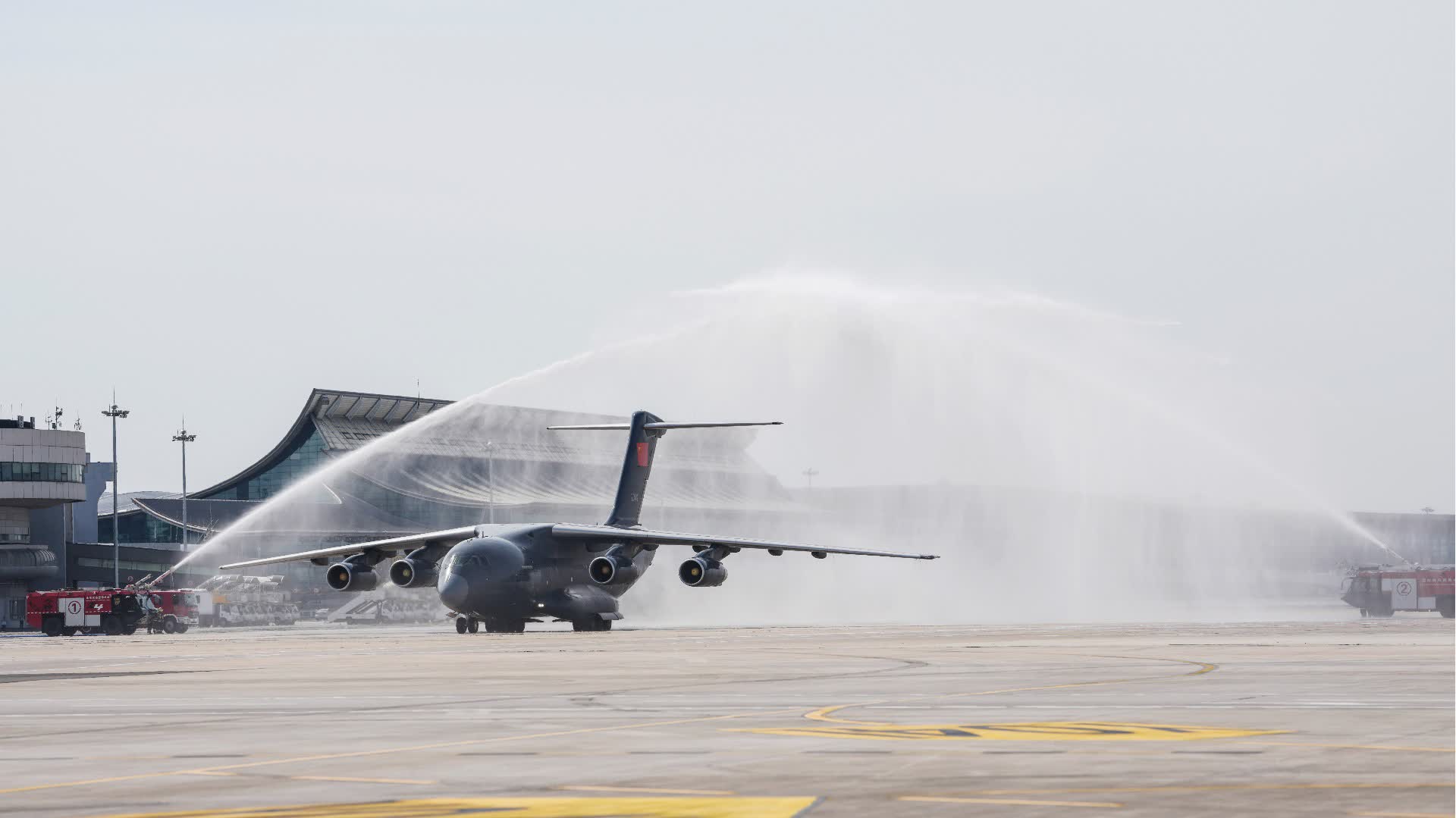 10時57分,空軍運–20專機緩緩降落在遼寧瀋陽桃仙國際機場。專機進入中國領空後,空軍4架殲–20戰鬥機護航,並在機場上空通場。「雙20」同框向志願軍烈士致以崇高敬意,桃仙國際機場以「過水門」航空最高禮儀迎接志願軍烈士遺骸回家。