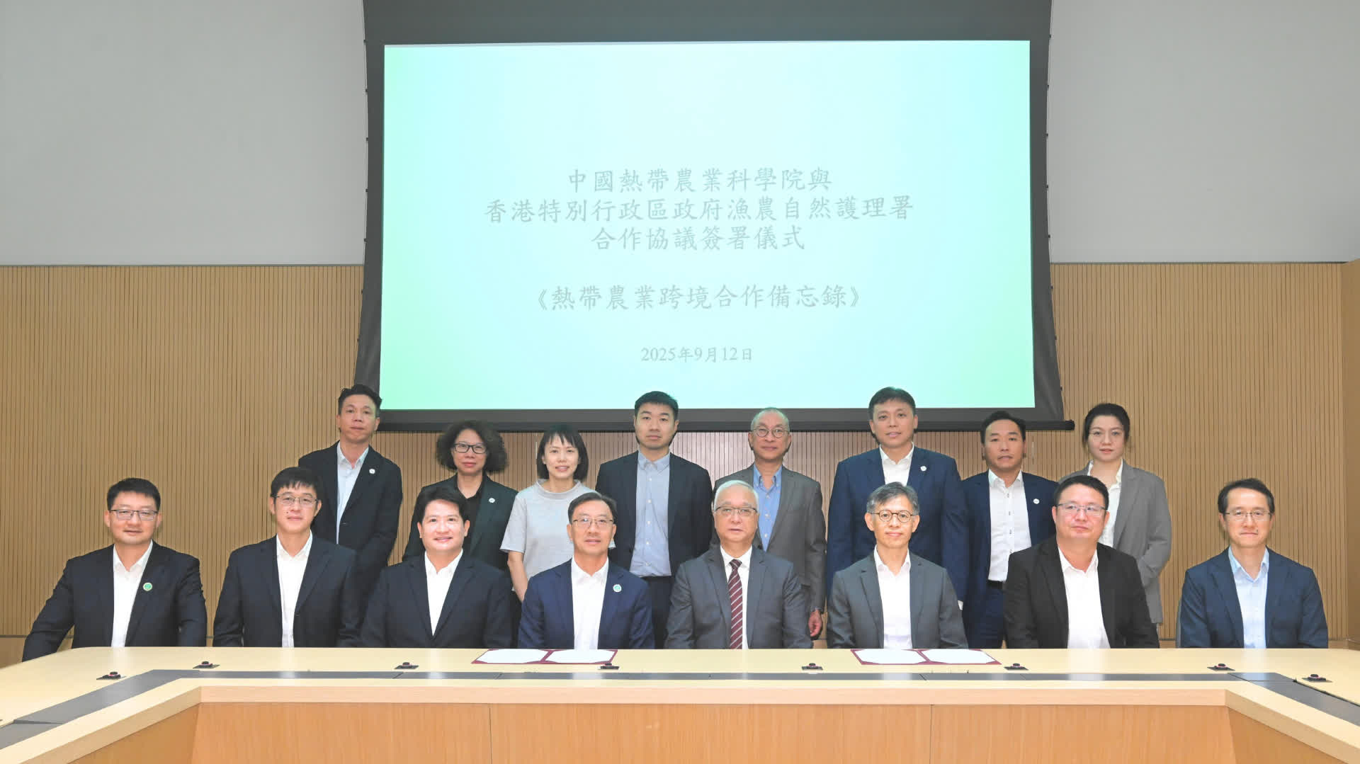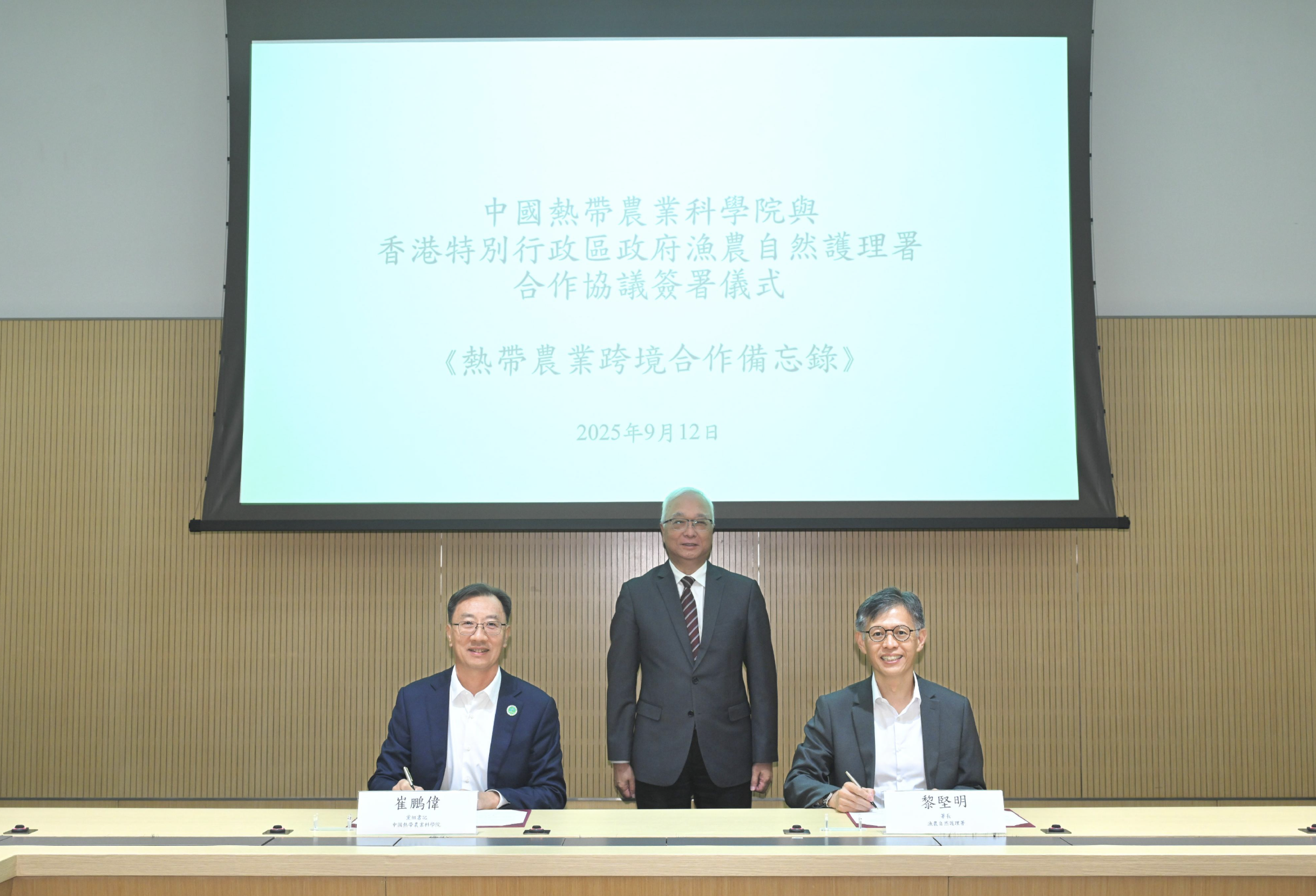 在環境及生態局局長謝展寰見證下,漁護署署長黎堅明及熱科院副院長崔鵬偉簽署《合作備忘錄》。謝展寰表示,這次香港特別行政區政府與熱科院合作,以創新為驅動,以科技為引領,共同推進現代化農業建設,不但為本地的農業發展注入新的科技動力,亦為粵港澳大灣區乃至國家的農業可持續發展貢獻更大力量。