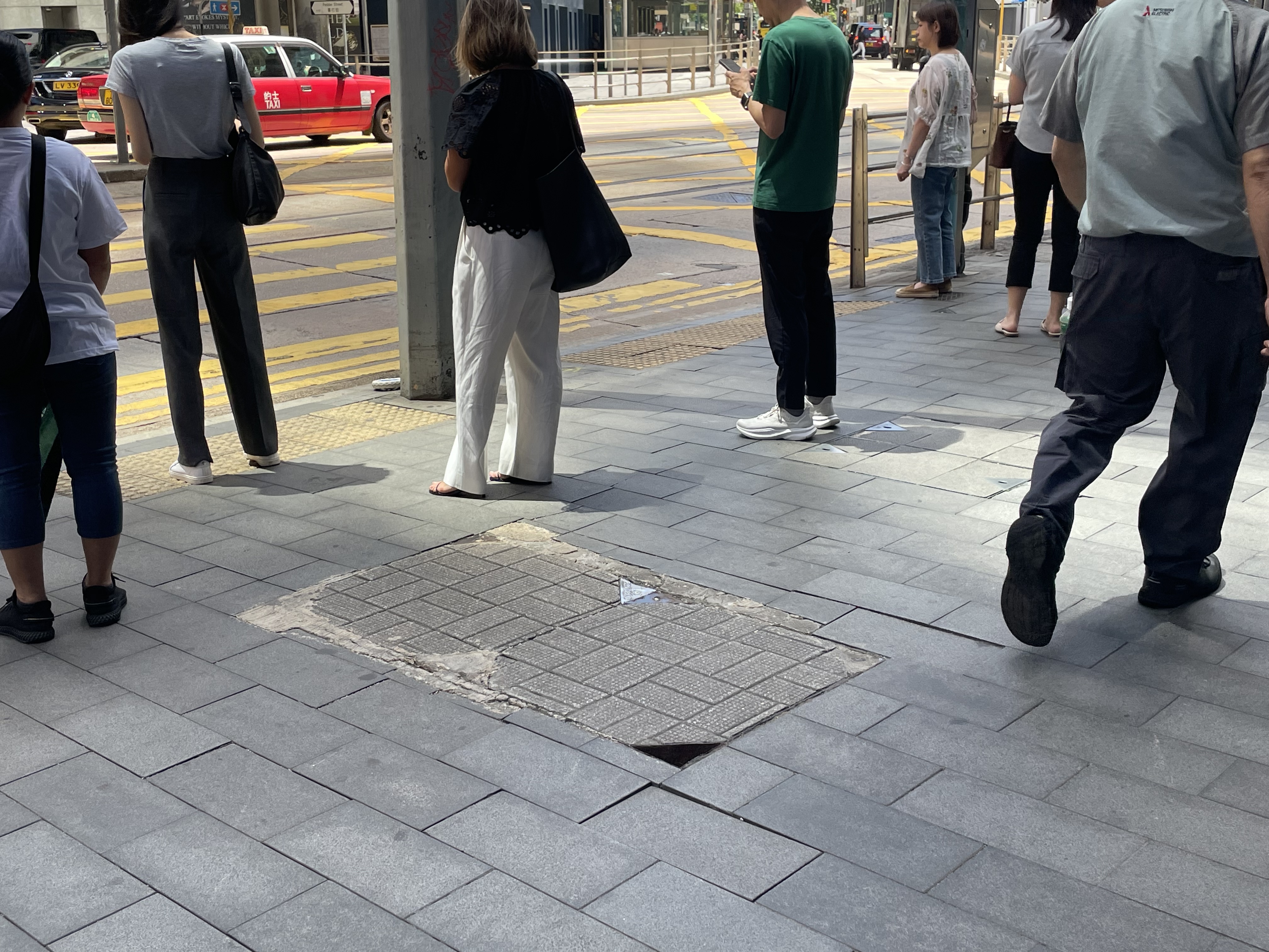 另外,中環站C口處附近,行人路面瀝青與地磚混和鋪製,導致路面不平,甚至有一處井蓋出現缺口,缺口大小近乎幼童腳掌大小。