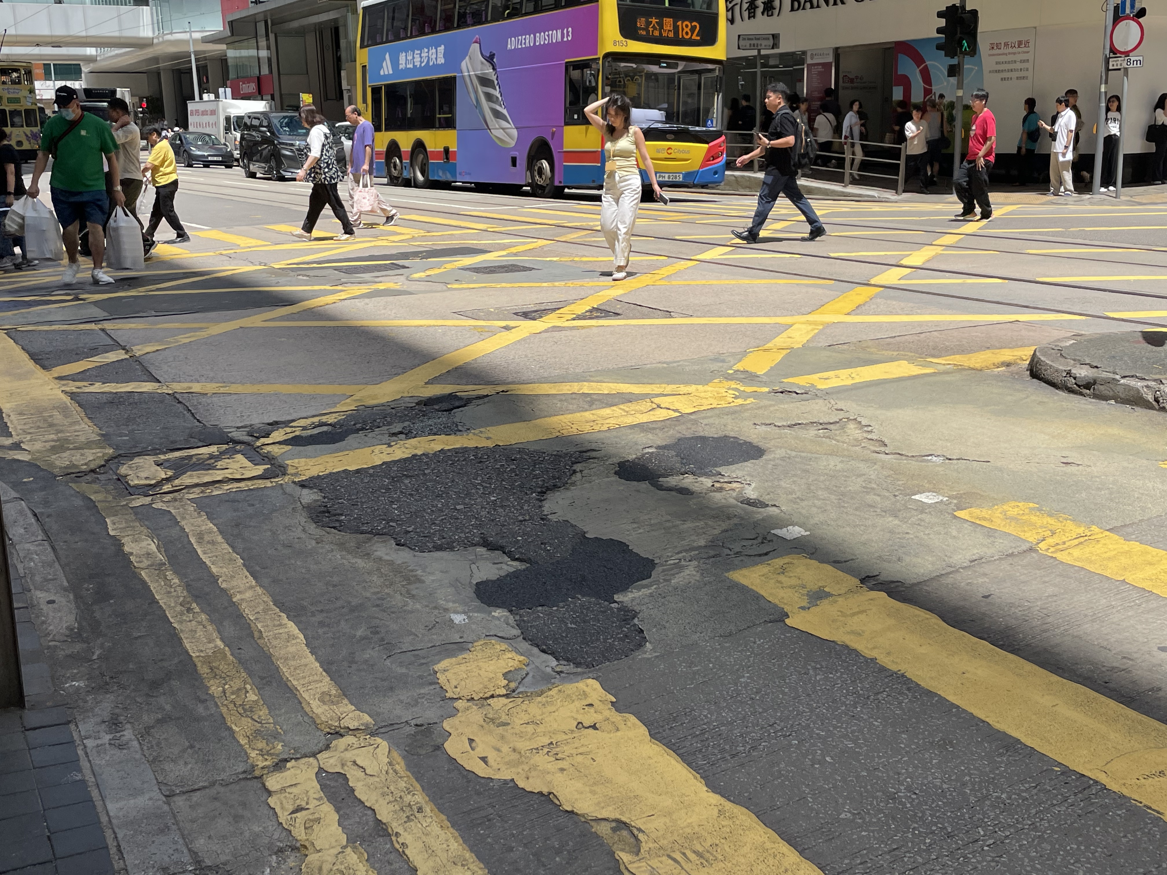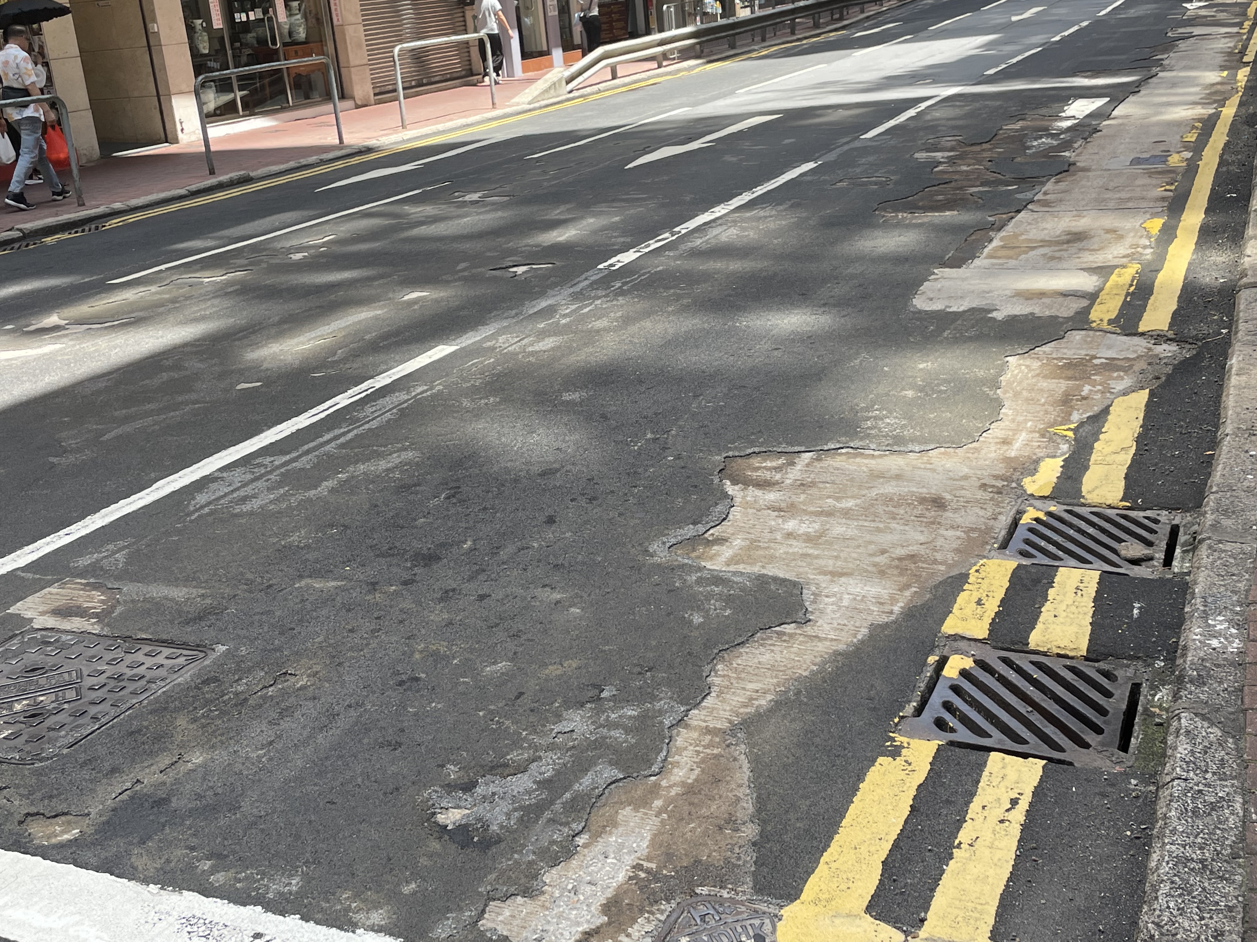 此外,行車路面亦有道路凹凸不平、破裂的情況。張嘉恩提及較嚴重的地點,包括皇后大道中244號近樂古道路面,及德輔道中路段等。