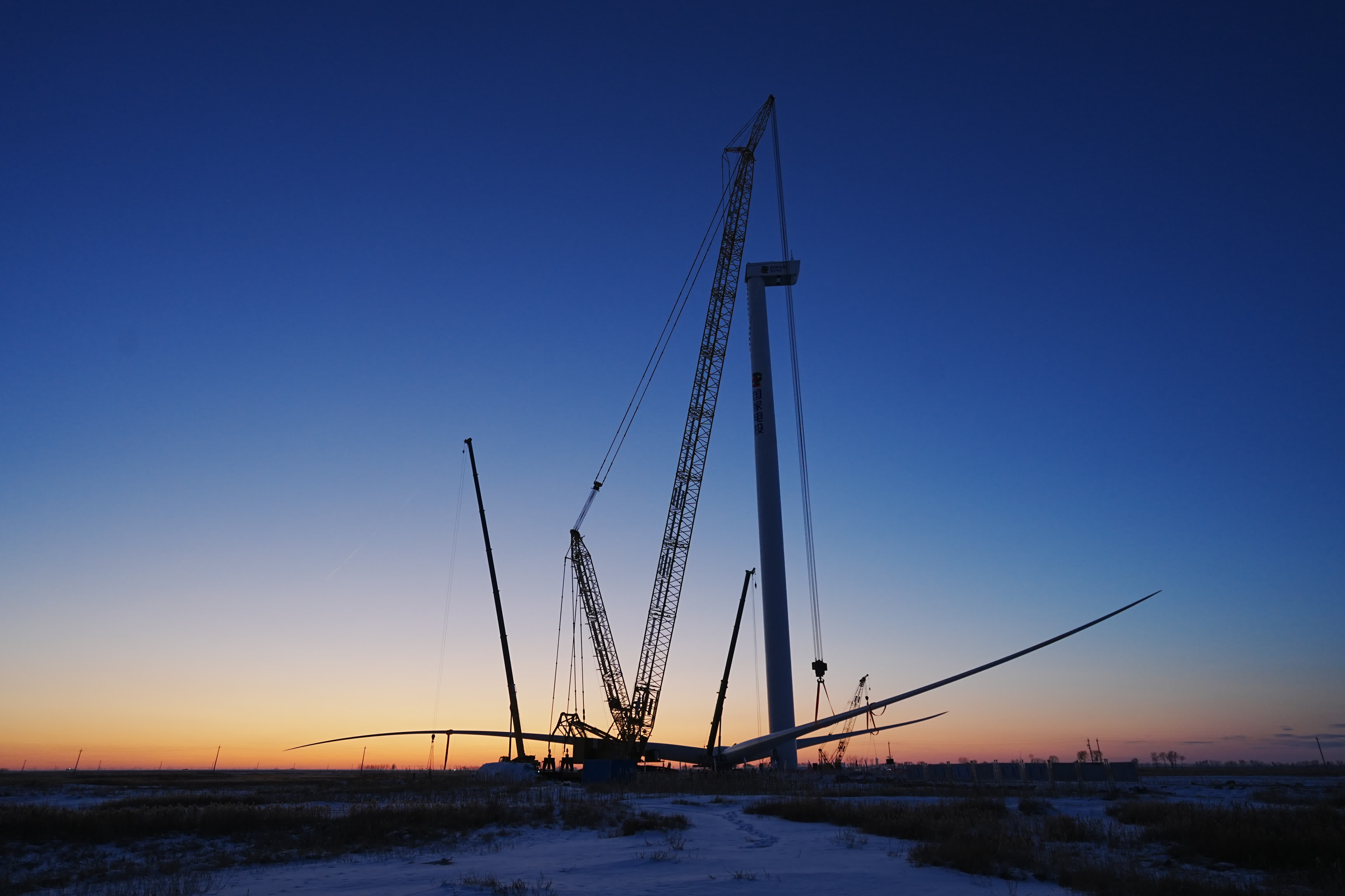 自2023年9月開工以來,項目團隊綜合考慮地況、天氣等因素,及時調整每台風機匹配的施工方案,確保風機吊裝的安全、高效。結合東北地區冬季時間較長和極寒天氣的特殊氣候環境,科學部署設備進場時間,精準搶抓施工的窗口期。質量管控方面,項目團隊嚴格把關塔筒、螺栓力矩驗收、葉輪組件對接等關鍵工序,紮實做好檢查和驗收工作,以毫米級的連接精度,順利完成了全部吊裝任務。