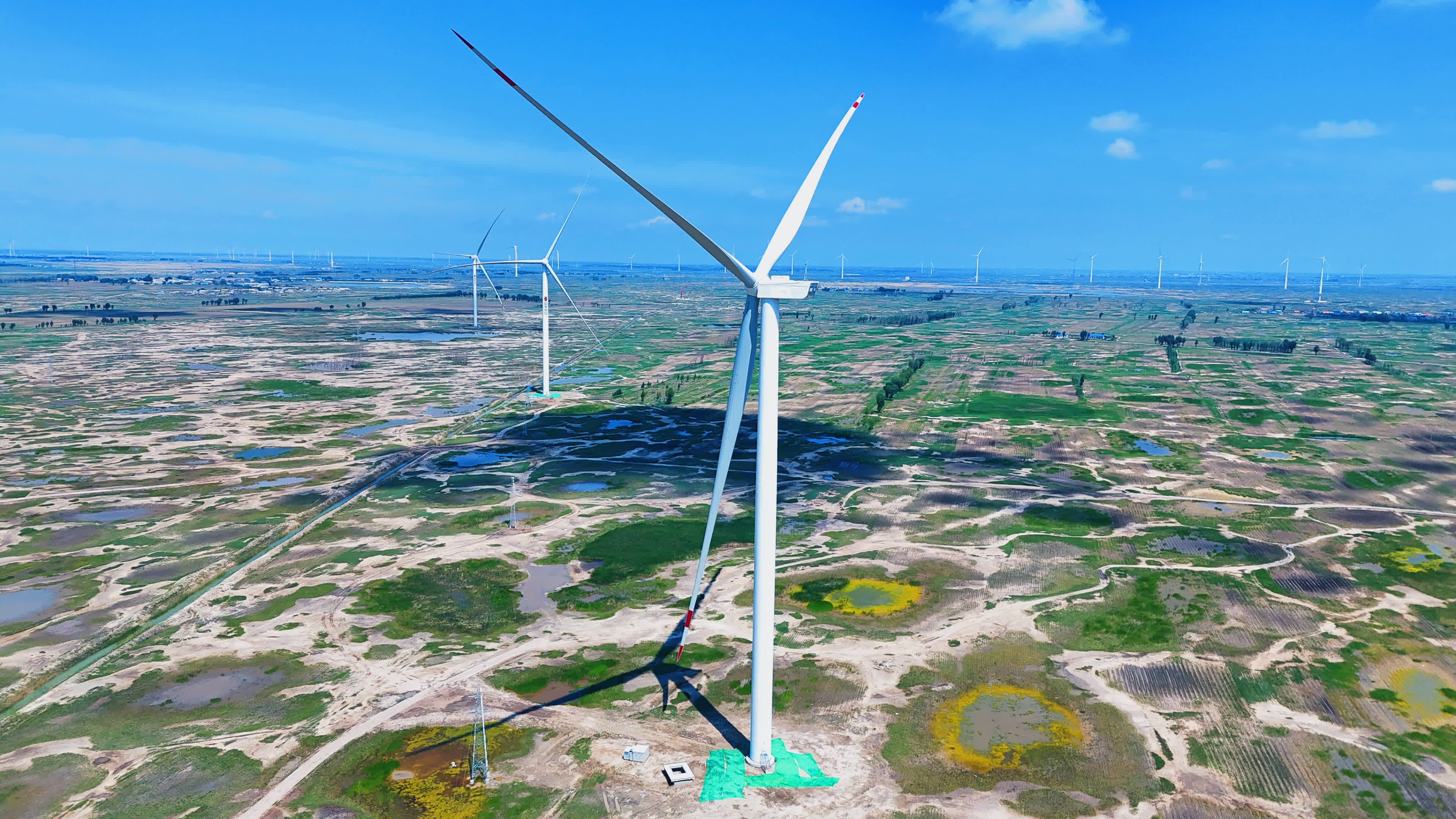 鹽堿地上,巨翼舒張,三片葉輪將無形的風縷匯聚成電流錦網,織就無盡的綠色動能。該項目投產運營後,每年減少的碳排放相當於為50萬戶普通家庭提供一年生活用電而產生的碳排放。