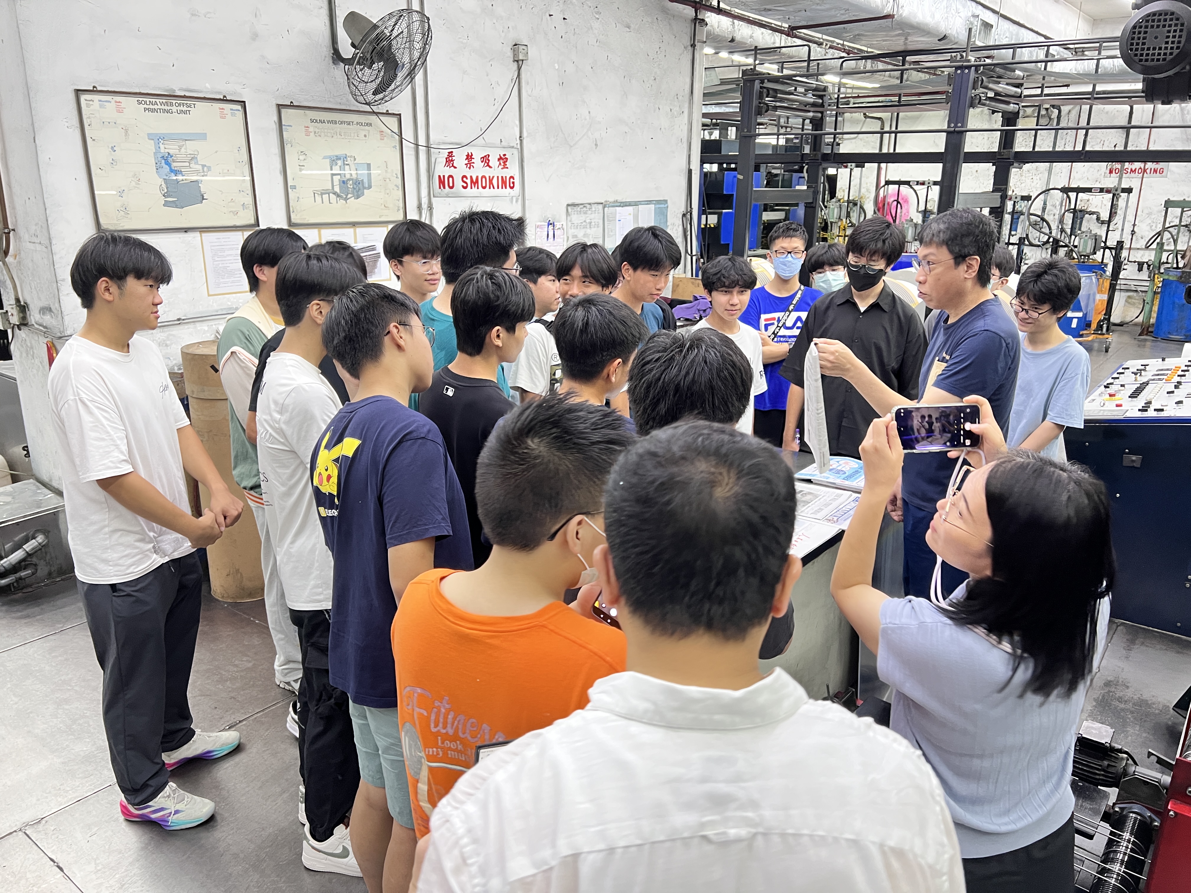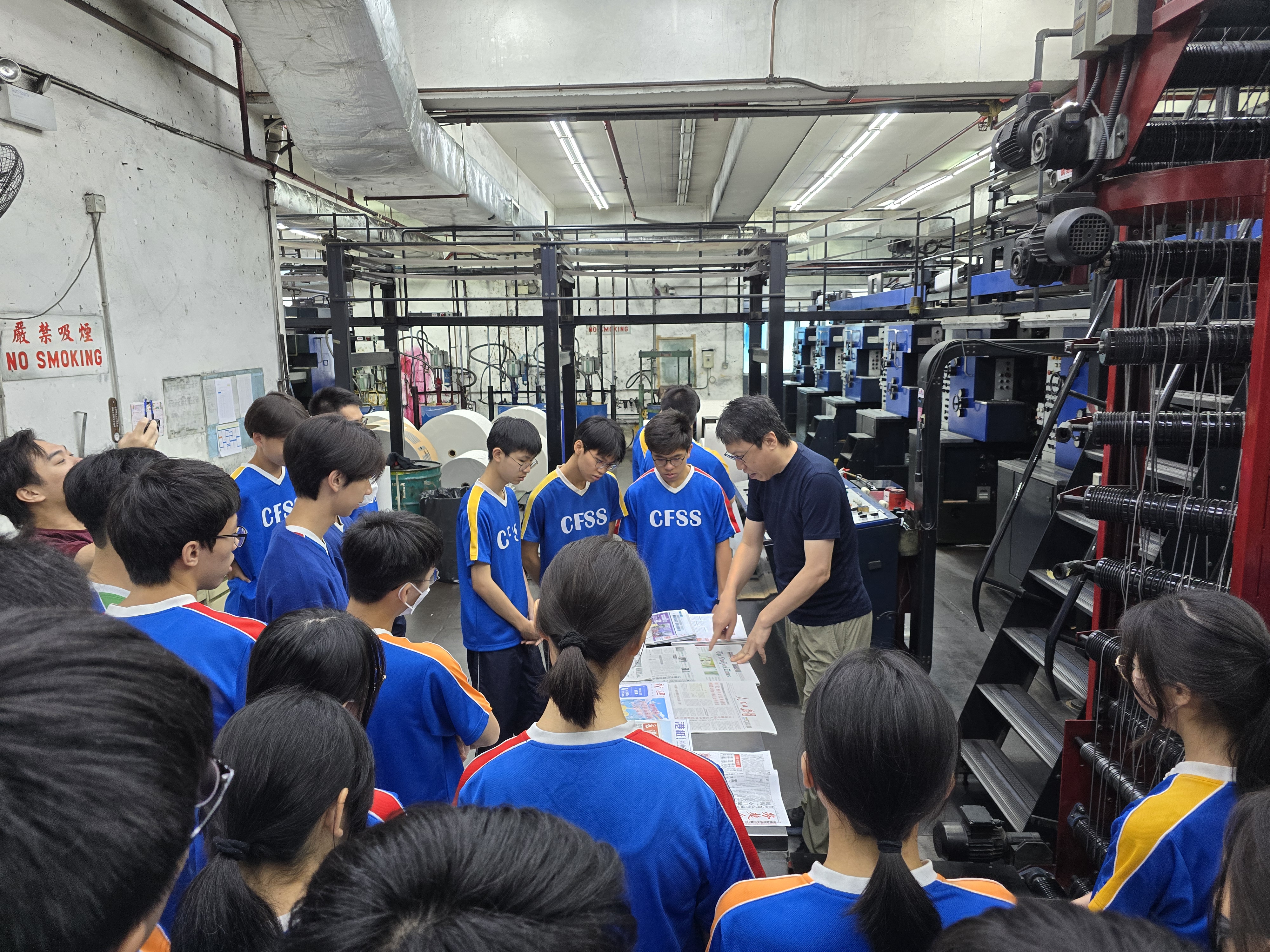 活動首站來到集團現代化印刷廠房。集團三友印務副人事行政經理臧志羽以生動的語言講解高速印刷機的彩印原理和過程,包括紙張選擇。香港仔工業學校的同學們在筆記本上認真記錄。中華基金中學的同學們親手觸摸還帶着溫度的報紙,對油墨速乾技術嘖嘖稱奇。工作人員更透露,為保障報紙準時送達,夜班工人需要在凌晨完成全部印刷,同學們對媒體從業者的精神肅然起敬。