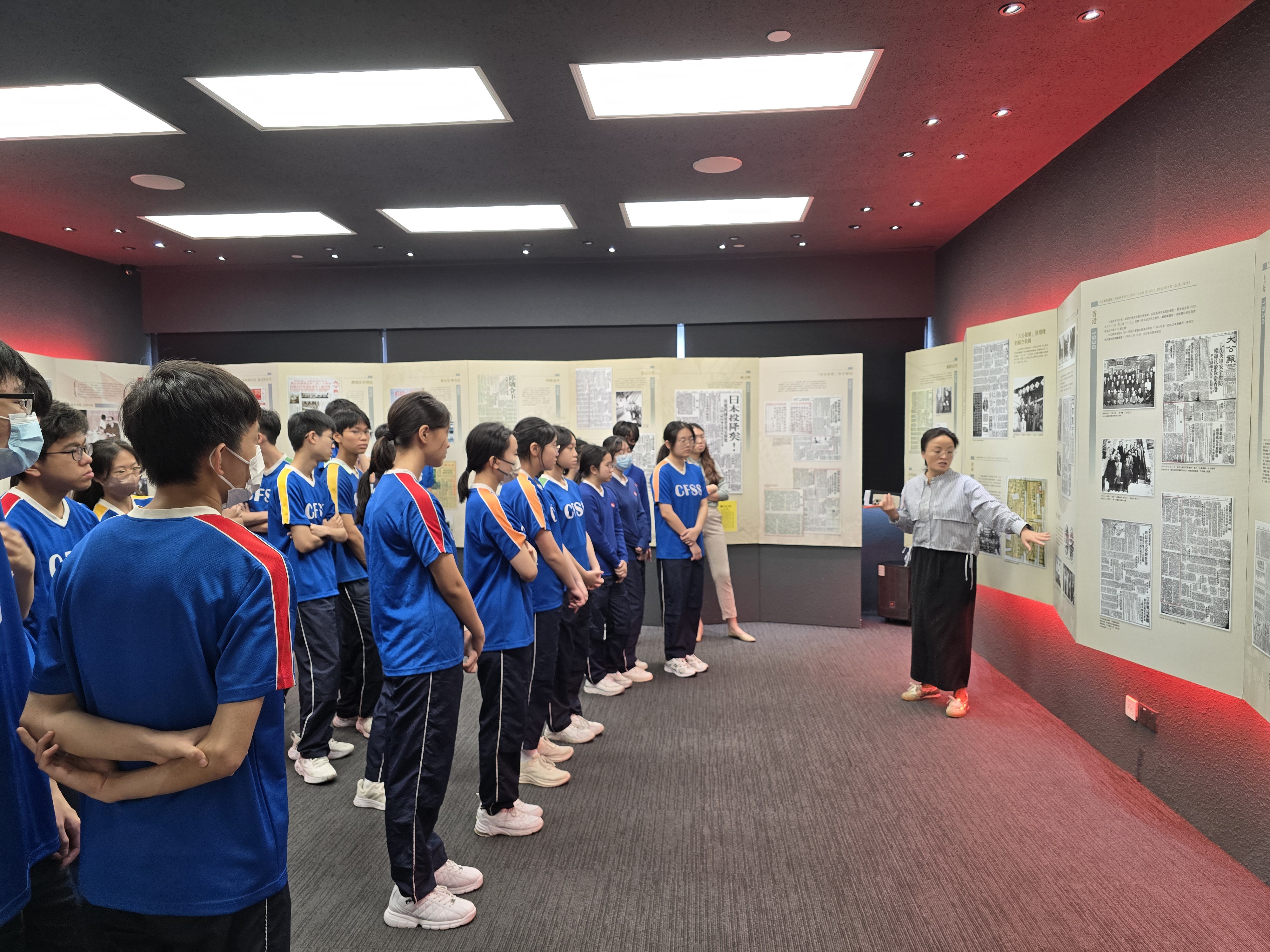 在報史館,集團全媒體中心創意項目部副總監白蘭欣以珍貴舊報紙樣本串起媒體集團的發展史。香港仔工業學校師生被1945年日本投降時的《大公報》版面所吸引,同學發現「當年的新聞標題字體比現在大很多」。導師解釋,這是因為當時識字率不高,大字更能吸引讀者。
