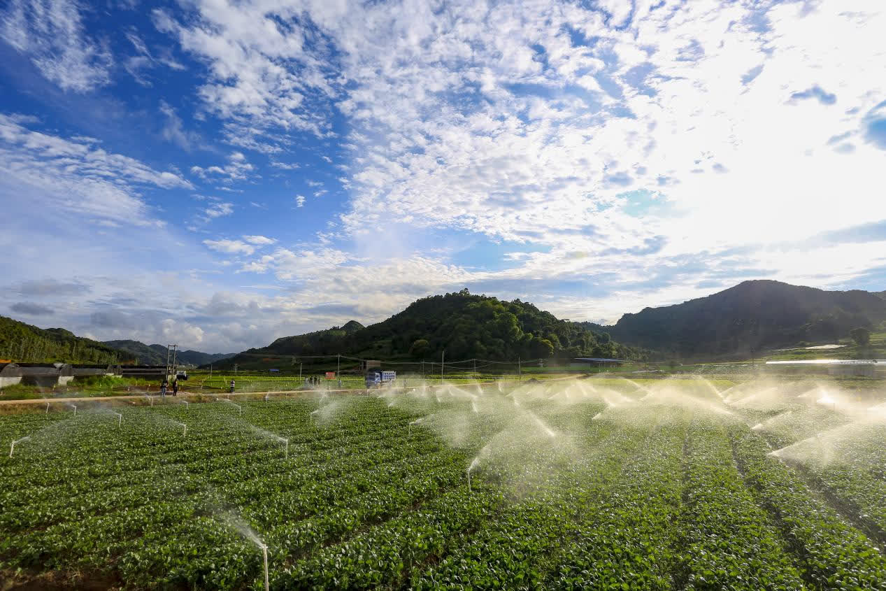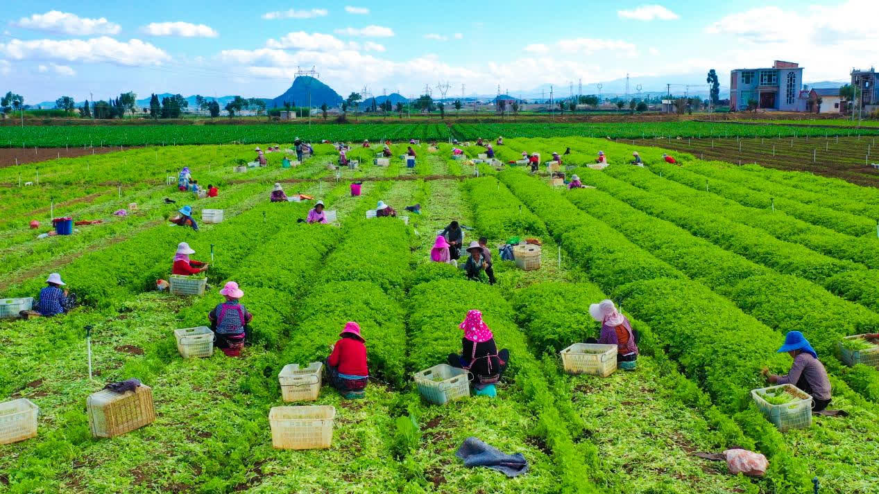 走進雲南省文山州硯山縣興發蔬菜種植基地,連片的綠色生態蔬菜映入眼帘,工人們在田間忙碌着。硯山縣興發蔬菜種植有限公司負責人江育裕介紹,現有蔬菜基地6400畝,每年向大灣區銷售蔬菜1.4萬噸,供應的蔬菜中主要以菜心為主,菜心也最受市場青睞。基地常年用工800人,每年能為當地群眾帶來3000餘萬元(人民幣,下同)的務工收入。