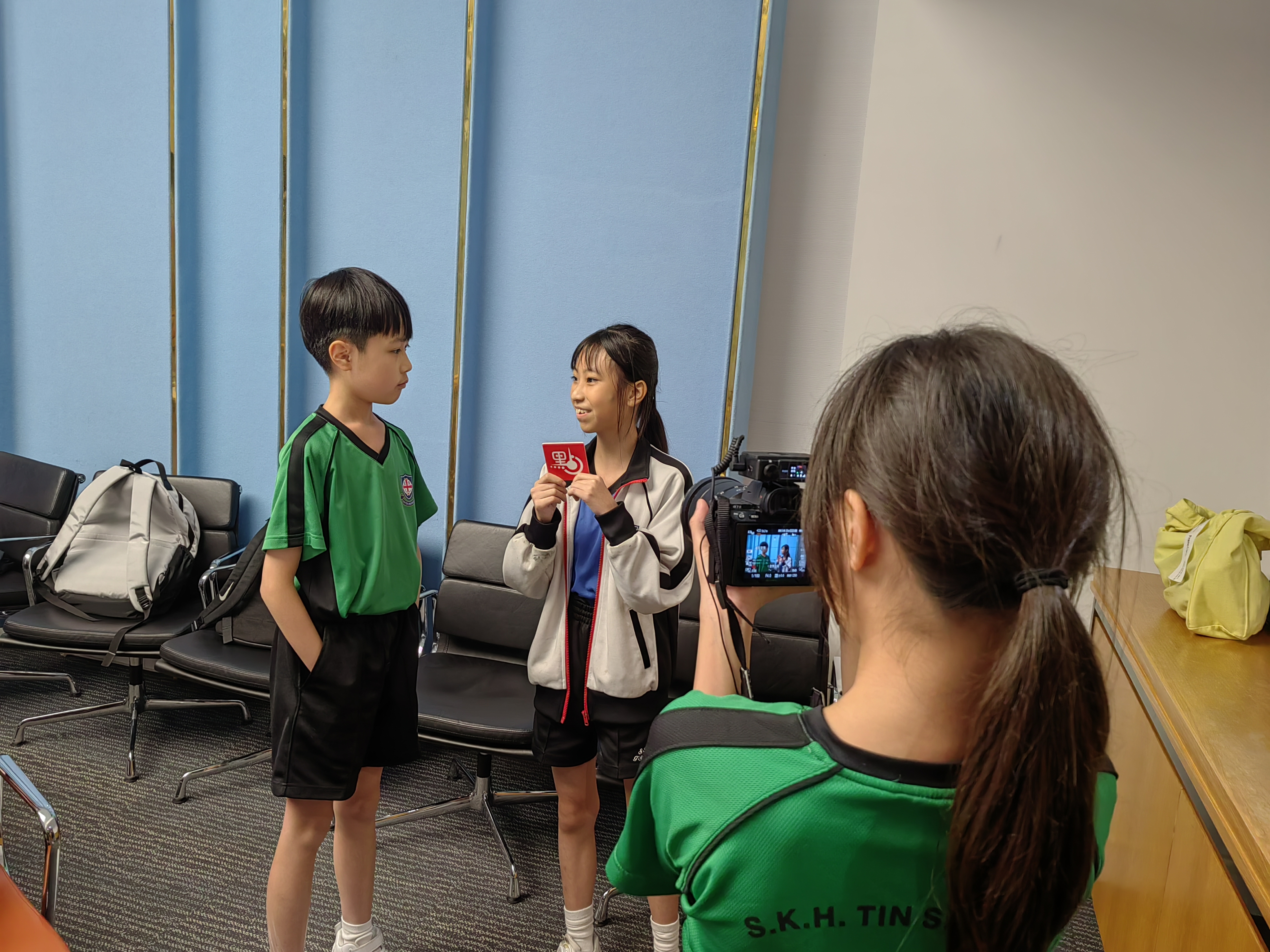 在全媒體中心的演播廳,同學們坐在主播台,模擬未來全運會直播時的現場採訪。靈愛小學的學生化身運動員說道,「作為香港隊員,我最想用普通話、粵語和英語三語感謝市民和全國觀眾的支持!」