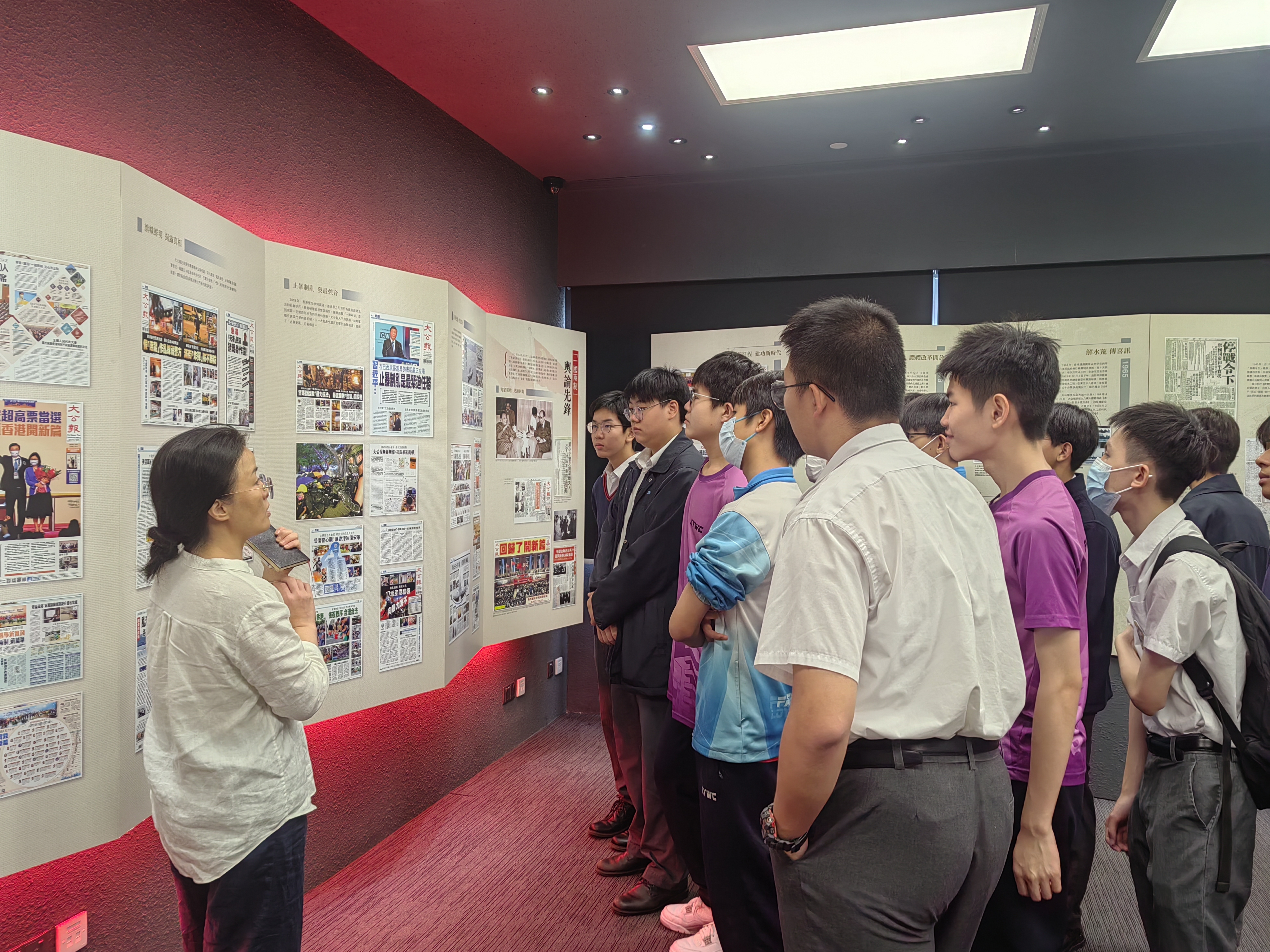 在報史館,一份1941年香港淪陷時期的《大公報》珍本引起郭一葦中學成員的關注。「當時記者如何在戰火中堅持辦報?」面對提問,集團創意項目部副總監白蘭欣講述老報人不畏艱難傳遞新聞的故事。