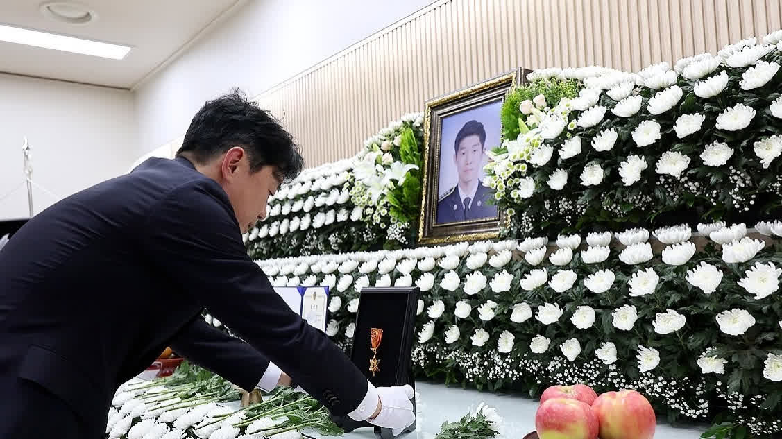 報道稱,韓國總統秘書室室長姜勳植當天前往設在仁川市一處殯儀館,代讀李在明發來的唁電,並向逝者追授勳章。李在明在唁電中表示,他對為拯救生命而犧牲自己的李在錫警長表示深切哀悼,並永遠銘記那些身穿制服的英雄的獻身精神。他還對逝者家屬和同事表示深切慰問,祈願逝者安息。