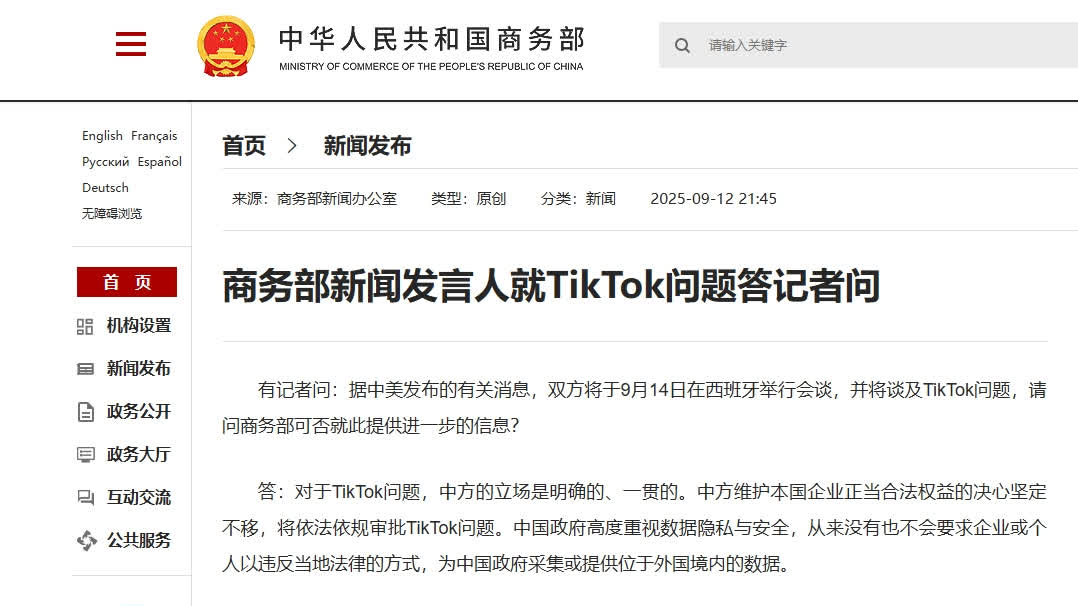 據商務部網站今日(12日)消息,商務部新聞發言人就TikTok問題答記者問。有記者問:據中美發布的有關消息,雙方將於9月14日在西班牙舉行會談,並將談及TikTok問題,請問商務部可否就此提供進一步的信息?