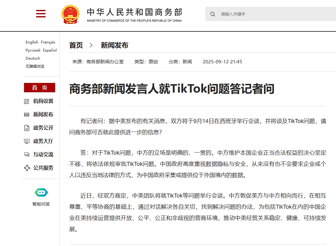 商務部新聞發言人表示,對於TikTok問題,中方的立場是明確的、一貫的。中方維護本國企業正當合法權益的決心堅定不移,將依法依規審批TikTok問題。中國政府高度重視數據隱私與安全,從來沒有也不會要求企業或個人以違反當地法律的方式,為中國政府採集或提供位於外國境內的數據。