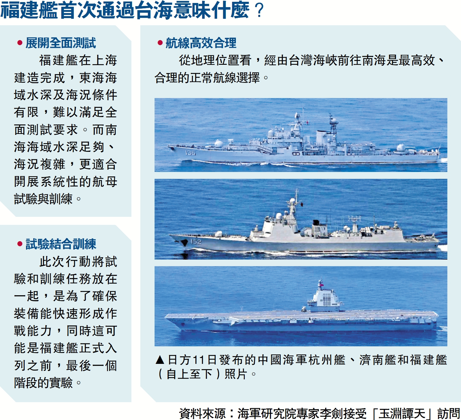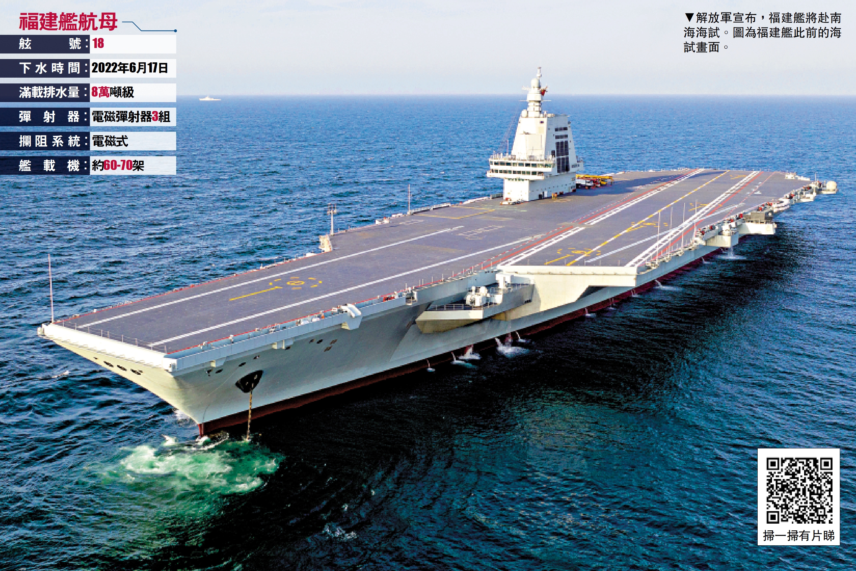 (大公報 記者朱燁、凱雷 實習記者張芮淇、黃佳賢 北京報道)中國人民解放軍新聞傳播中心官方微博12日宣布,「福建艦將赴南海海試」!海軍新聞發言人冷國偉海軍大校12日介紹,日前,我國第3艘航空母艦福建艦通過台灣海峽,赴南海相關海域開展科研試驗和訓練任務。這次組織福建艦跨區試驗訓練,是航母建造過程中的正常安排,不針對任何特定目標。
