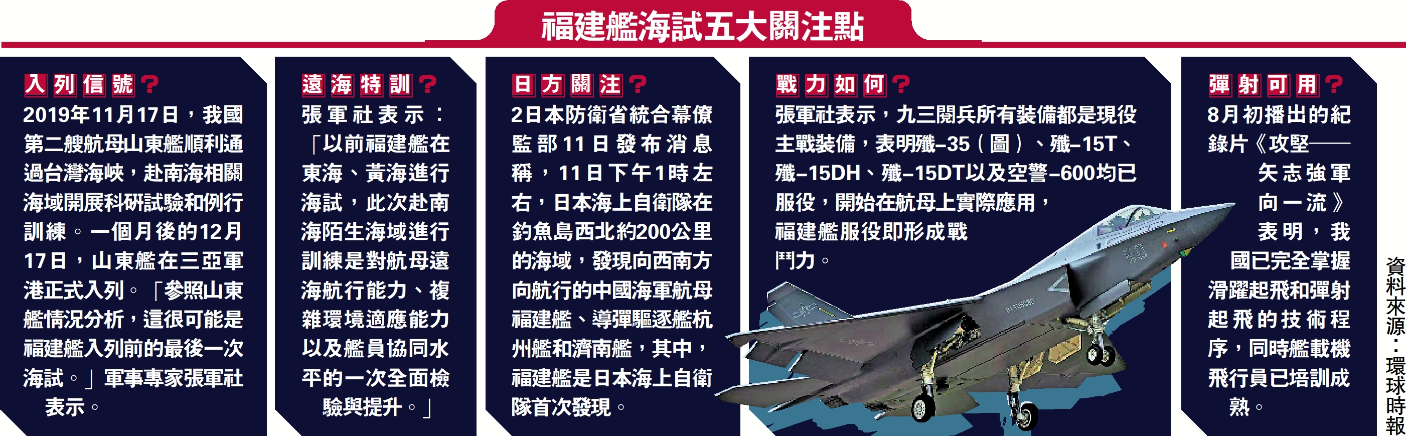 對於福建艦首赴南海試驗,專家接受大公報記者訪問時表示,福建艦或如2019年山東艦般在完成南海最終測試後加入現役,相應新型電磁彈射型艦載機料將與福建艦展開彈射訓練。