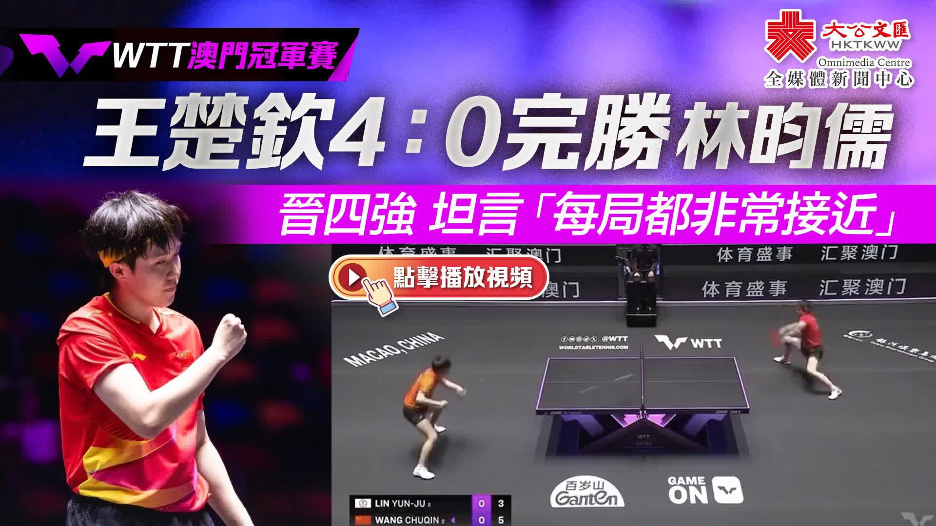 大公文匯網報道,9月13日,WTT澳門冠軍賽男單1/4決賽,王楚欽以4-0戰勝中國台北選手林昀儒,晉級四強。