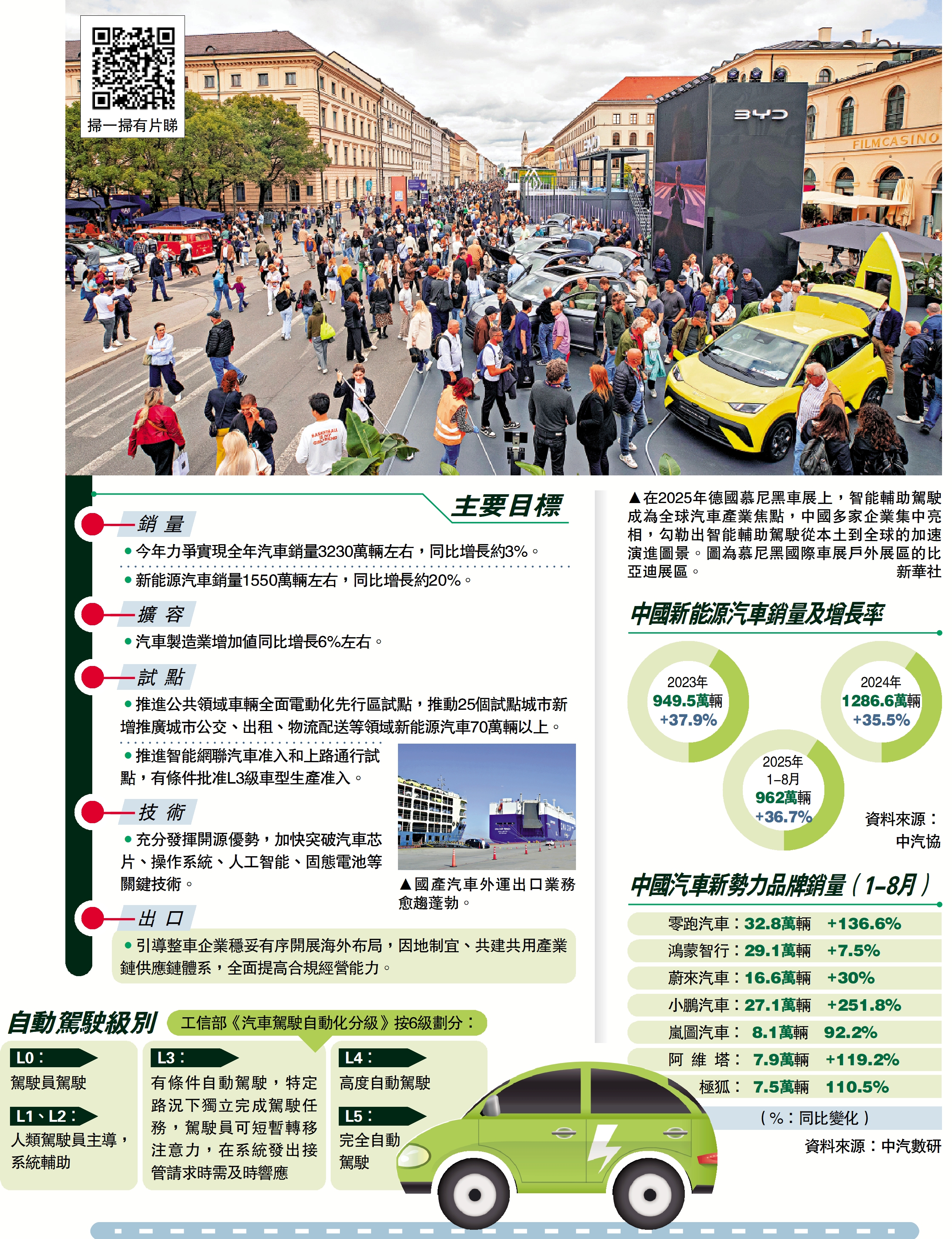 (大公報記者 郭瀚林)近年來,中國汽車產業高速發展,產銷量連續多年穩居全球第一。近日,工信部等八部門印發《汽車行業穩增長工作方案(2025-2026年)》(簡稱《方案》),從擴大國內消費、提升供給質量、優化發展環境、深化國際合作等維度,提出15個方面工作舉措和3個方面保障措施。