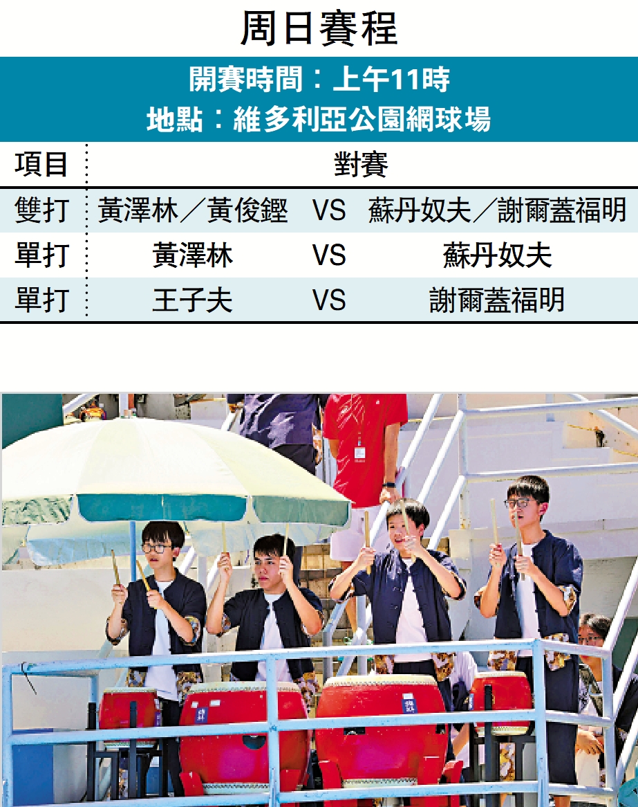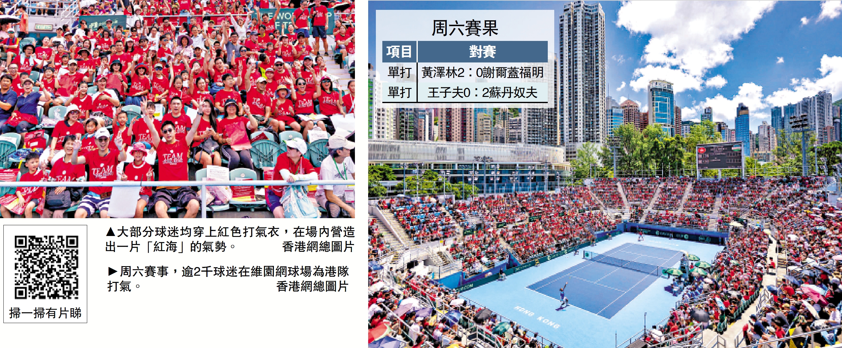 (大公報記者 朱家立〈文、圖〉)中國香港男子網球代表隊在周六(13日)起,一連兩日在維多利亞公園網球場出戰5場3勝制的戴維斯盃世界Ⅱ組賽事,與烏茲別克斯坦隊爭奪世界Ⅰ組附加賽資格。能容納約3600人的維園主場坐近七成觀眾,港隊代表黃澤林在球迷打氣聲下,首仗就以直落兩盤先拔頭籌,隊友王子夫則在第2仗以0:2見負,首日兩隊暫打平1:1。今日進行餘下三場「生死鬥」,其中黃澤林將會在首場雙打及次場單打賽事上陣。