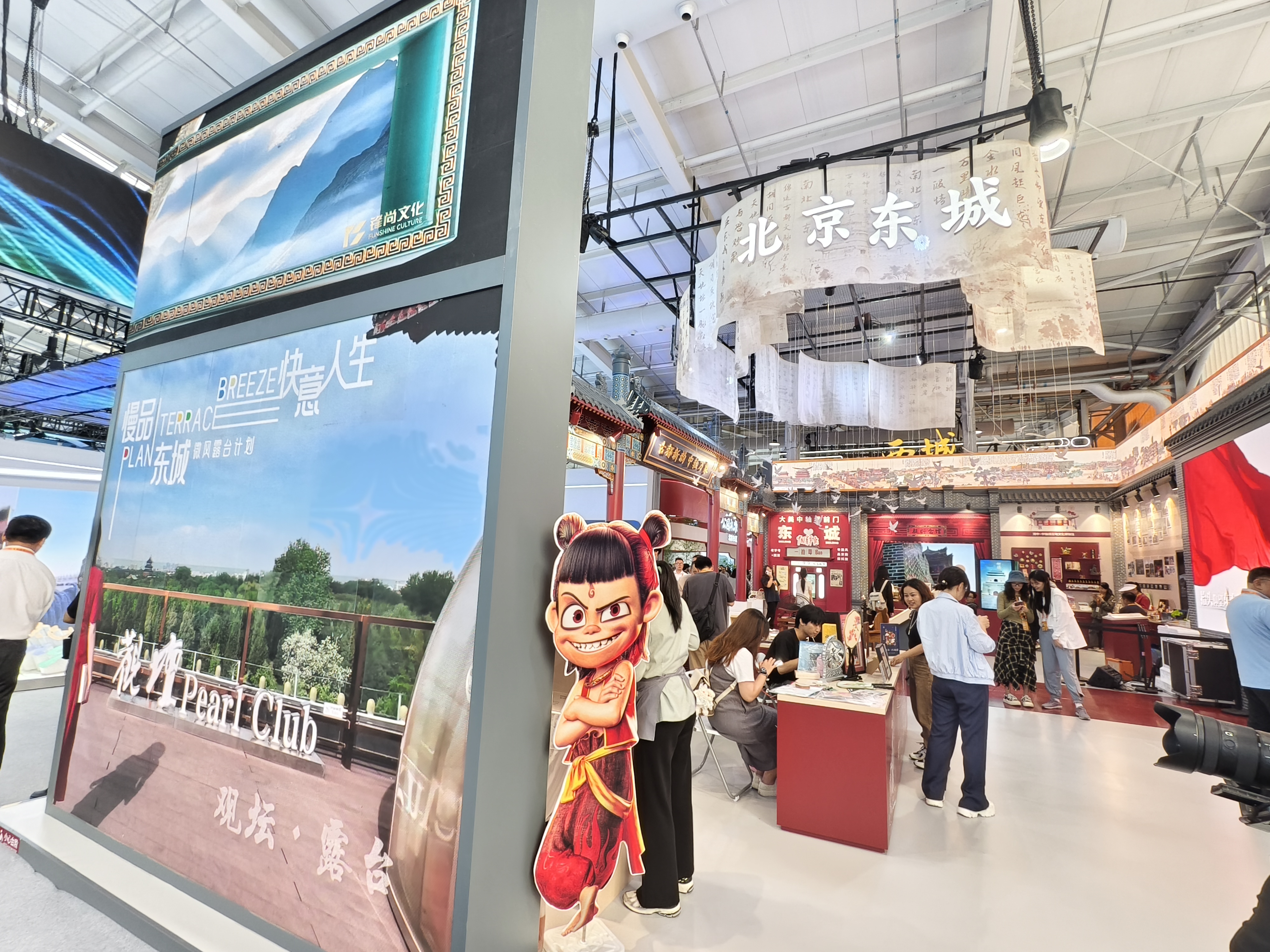 走進2025服貿會東城展區,巍峨的「前門大街五牌樓」率先映入眼帘,北京中軸線串聯起前門、隆福寺、王府井三大頂流商圈場,展區正中一幅動靜交融的中軸長卷緩緩鋪展——長卷底圖源自《圖說北京中軸線》,遺產點位徐徐展開,同步呈現《飛躍世界遺產北京中軸線》的壯闊影像。「正陽門下、紫禁之東,聞聽暮鼓晨鐘……」環顧展廳四周,LED拼接而成的「數字屋檐」時而映出藍天白雲的清朗,時而切換《中軸圖卷——老北京風物畫》的古樸,空中閃爍的飛鴿裝置與屏幕內容相映成趣,以「五牌樓為基、數字屋檐為幕、中軸地標為脈」,述說北京中軸線的千年故事。「中軸溯光·時空扉頁」翻書互動裝置吸引很多觀眾駐足。這本「數字典籍」融合傳統書籍翻閱感與現代交互設計,訪客輕觸翻頁、點擊交互,便能通過動態影像喚醒塵封記憶——《1909年的北京》系列視頻、「騎遊最美中軸線」影像、北京中軸線遺產點位老照片等內容,書頁開合間重疊百年前的中軸盛景與當下街巷光影。「藻井璇穹·星河共築」數字藝術裝置以隆福寺天宮藻井為靈感,營造「天圓地方」的無限延伸空間,讓千年建築元素在互動中煥發年輕化表達。