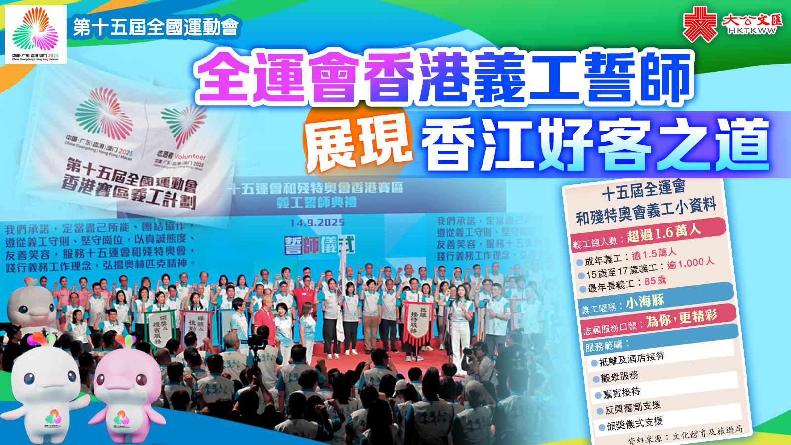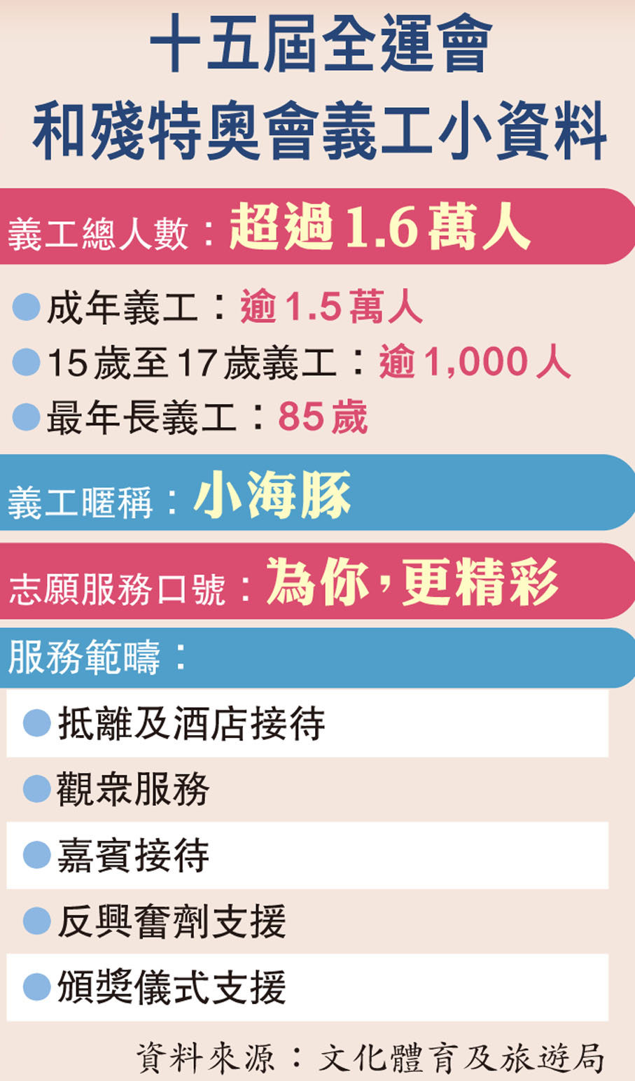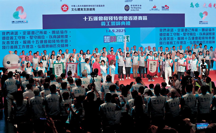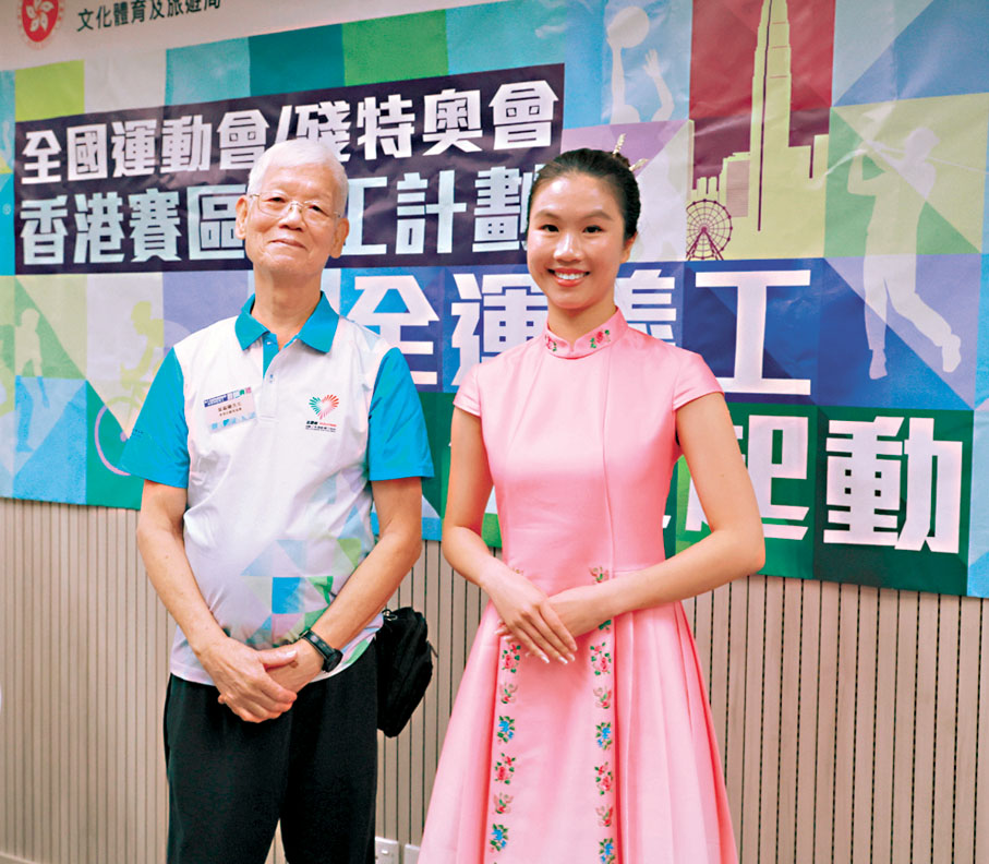 (香港文匯報 記者 吳健怡)第十五屆全國運動會和全國第十二屆殘疾人運動會暨第九屆特殊奧林匹克運動會進入倒數階段,義工隊亦準備就緒。全國運動會香港賽區統籌辦公室昨午舉行義工誓師典禮,近1,800名義工代表宣讀誓詞,以真誠服務十五運會和殘特奧會,並獲授予旗幟。當中85歲的葉錫剛為隊伍中最年長的義工;更有義工認為自己代表香港,為展現香港的美,她苦練儀態,重新學走路,每步只可跨出約30厘米,控制微笑時只露出6顆至8顆牙齒……特區政府文化體育及旅遊局局長羅淑佩表示,今次義工隊伍總人數超過1.6萬,是香港歷來最大的義工隊伍,期望他們能展現香港好客之道。