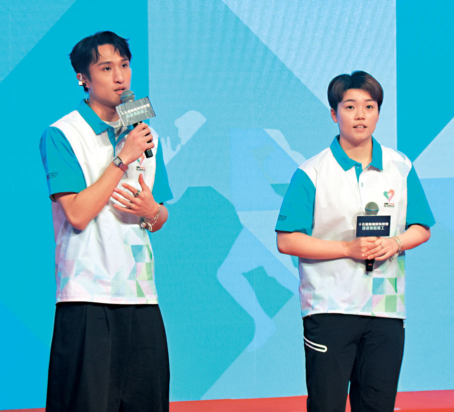 在巴黎奧運會女子重劍個人賽中奪得金牌的前劍擊運動員江旻憓,獲委任為義工大使,昨日她在義工誓師典禮上,帶領全體義工以高昂士氣宣讀誓詞,同時兩位將參加全運會的現役中國香港運動員,亦在現場為義工加油打氣。