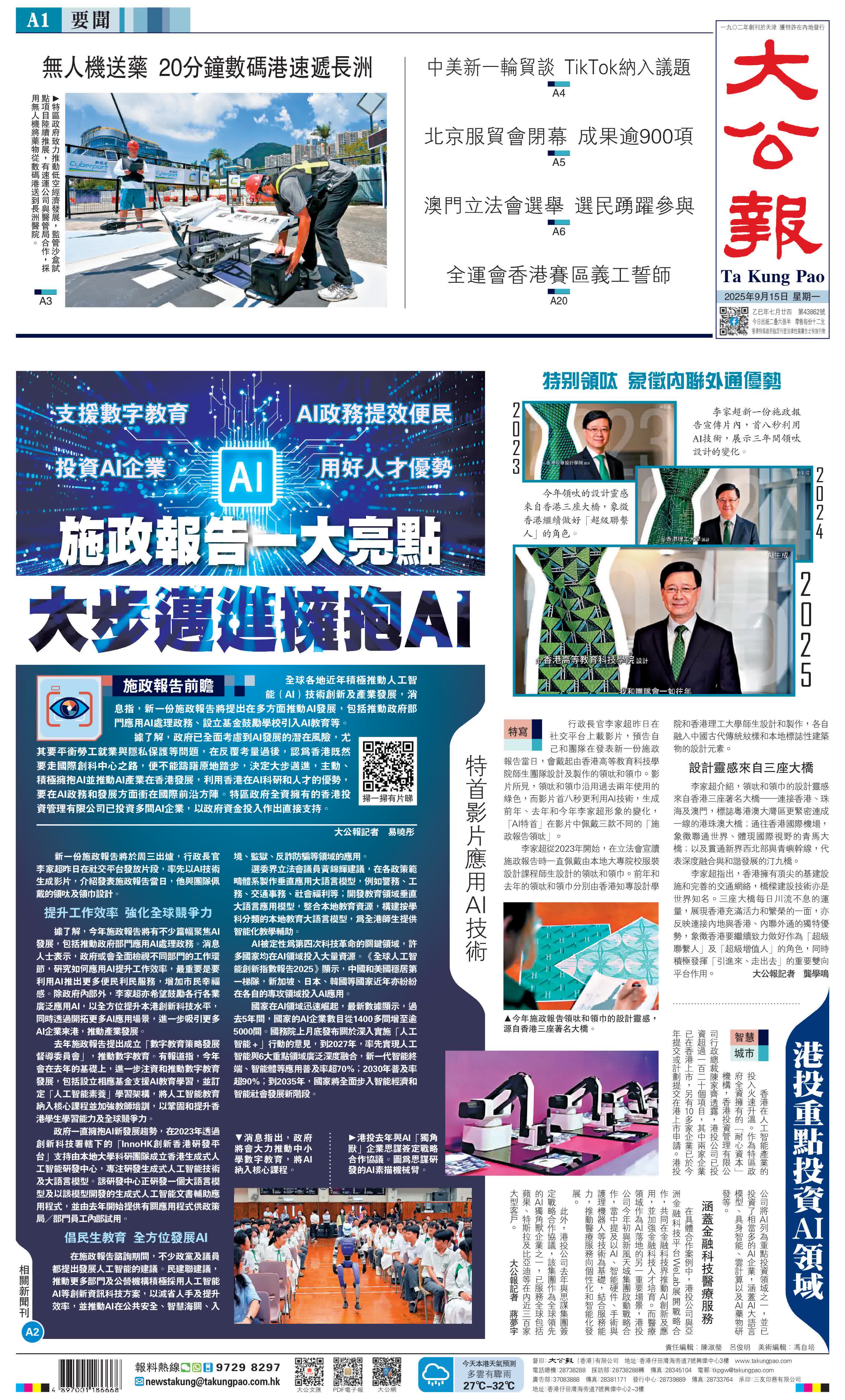 (大公報記者 易曉彤)全球各地近年積極推動人工智能(AI)技術創新及產業發展,消息指,新一份施政報告將提出在多方面推動AI發展,包括推動政府部門應用AI處理政務、設立基金鼓勵學校引入AI教育等。