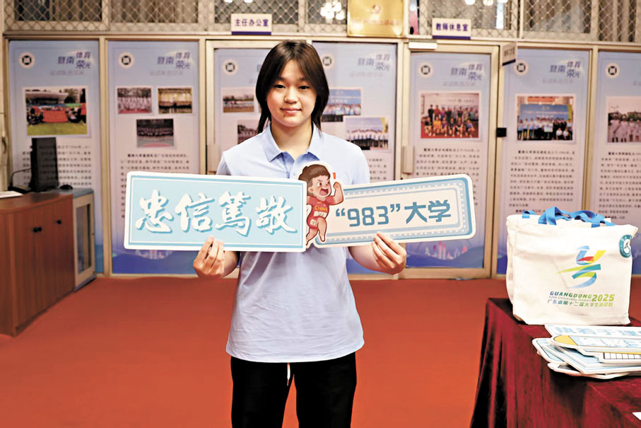 (香港文匯報 記者 李紫妍 廣州報道)今年9月開學季,全紅嬋、陳藝文、王楚欽、李雯雯等一批備受關注的年輕奧運冠軍們從賽場走進校園。日前,暨南大學正式迎來2025級新生,其中就有中國跳水奧運冠軍全紅嬋。香港文匯報記者從校方獲悉,她已在暨南大學體育學院辦理運動訓練專業本科生報到手續,並領取了學生證和新生大禮包等,正式成為該校的一名新同學。報到現場,她拿着「983大學」(蘇炳添2018年成為暨南大學老師,2021年東京奧運會跑出9秒83的成績,打破亞洲紀錄,編者註)和暨大校訓「忠信篤敬」的KT板,拍下了在校園的第一張留影。