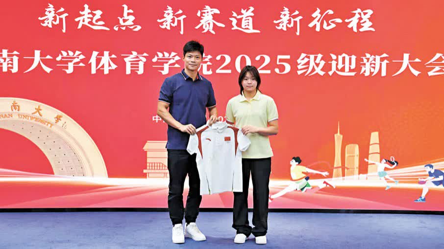 「選擇暨大,是你們與這所百年學府的雙向奔赴;求學暨大,是你們人生旅程中一次充滿無限可能的新征程。」報到當天,暨南大學體育學院召開了2025級迎新大會,「亞洲飛人」、暨南大學體育學院院長蘇炳添向包括全紅嬋在內的80多名新生致辭寄語。會上,全紅嬋為體育學院贈送了親筆簽名的巴黎奧運會出場服,蘇炳添親手接過這份極具紀念意義的「禮物」,並與全紅嬋合影留念。