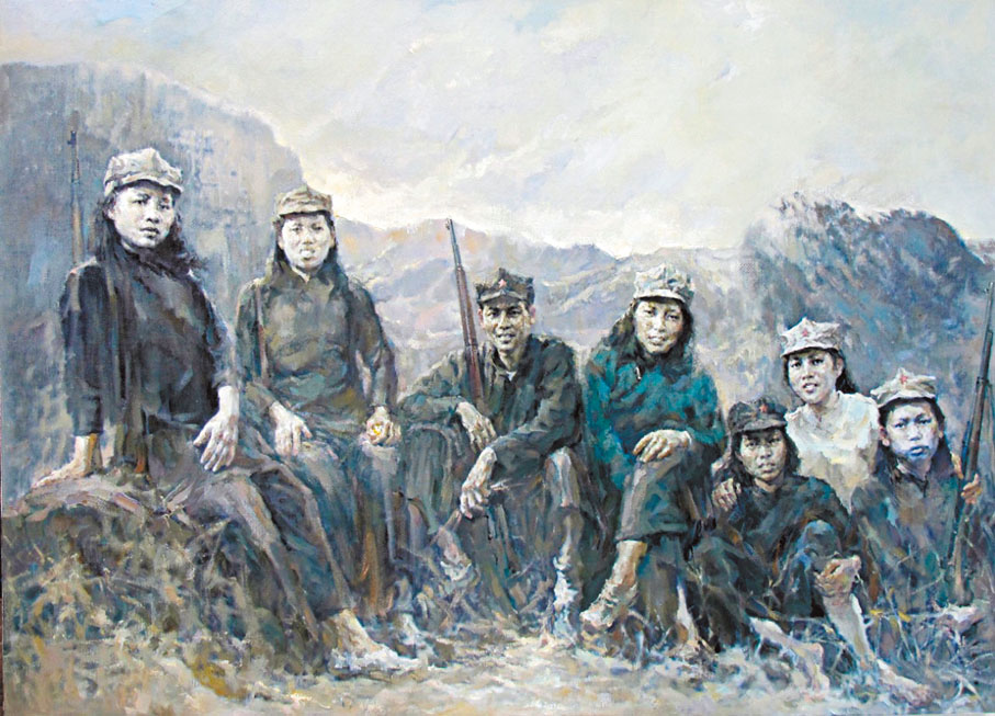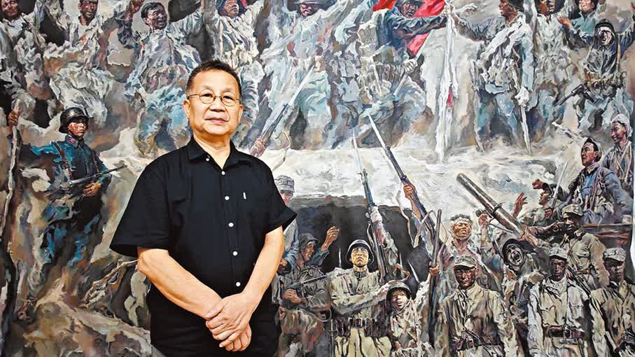 劉思東秉持為東縱留下「藝術印記」的初心。他耗時數年完成的巨幅油畫《史詩·中流砥柱—致敬東江縱隊》長達6米、高1.8米。畫面中心,頭戴客家涼帽的農婦形象格外醒目。「她代表母親,母親代表祖國,全體東縱將士為祖國而戰。」