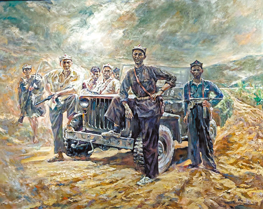 而在《游擊隊之歌—我的母親和她的東縱戰友》中,劉思東以細膩筆觸定格了母親與戰友並肩而坐的瞬間。質樸的構圖與殘酷戰爭形成強烈反差,油畫特有的肌理質感更凸顯出東縱戰士「樸素而浪漫」的精神氣質。