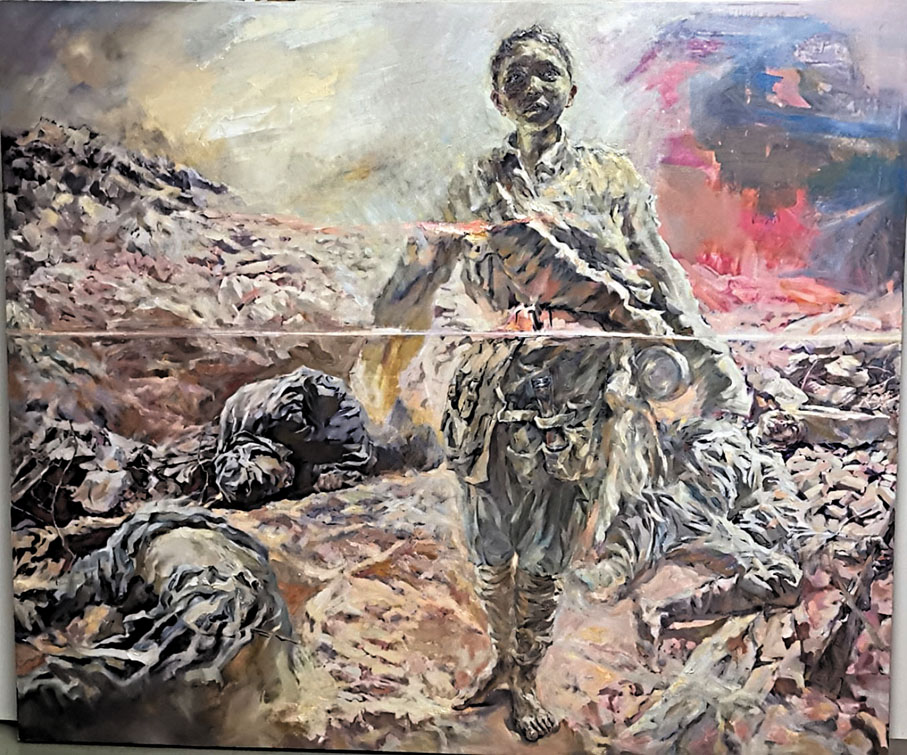 作品的中心位是一位娃娃兵,劉思東曾因畫這個娃娃兵而淚流滿面,感嘆如此年輕的孩子也要奔赴戰場。「作品中的娃娃兵是松山戰役7,000名娃娃兵的濃縮,當時已經打到娃娃們都要上戰場了,可見戰爭的殘酷。我想通過這幅畫告訴大家,要珍惜現在的生活,感受和平的來之不易。」