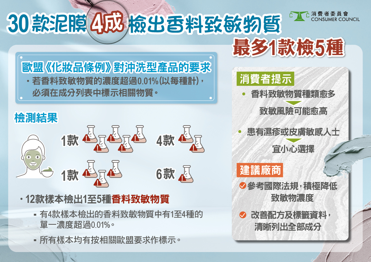 消委會建議,選購時宜細閱產品成分、使用方法和標籤資料。患有濕疹、過敏肌膚的人士,應小心選擇,避免使用含高濃度或多種致敏物質的產品;留意泥狀清潔面膜建議的駐留時間,駐留時間太長可能令皮膚過度乾燥,甚至增加過敏風險。當面膜開始乾涸時,宜以溫水稍為弄濕面部並輕柔打圈按摩,以帶走老化角質及粉刺污垢;即使屬油性肌膚亦應避免過度清潔,每星期使用1至2次泥狀清潔面膜已足夠,日常早晚則應以溫和洗面產品潔面,然後做好保濕,有助減少皮膚出油。