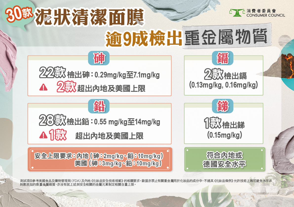 大公文匯全媒體報道,空氣中有大量污染物,容易堵塞毛孔,而泥狀清潔面膜具有良好的吸收力,有助深層清潔毛孔,去除污垢及多餘油脂,因此成為不少都市人深層潔面步驟的重要一環。消費者委員會(消委會)在新一期《選擇》月刊中測試30款泥狀清潔面膜樣本,發現有2款樣本重金屬檢出量超出內地及美國的標準上限,其中1款的砷及鉛檢出量均超標,另1款則檢出砷含量超標。