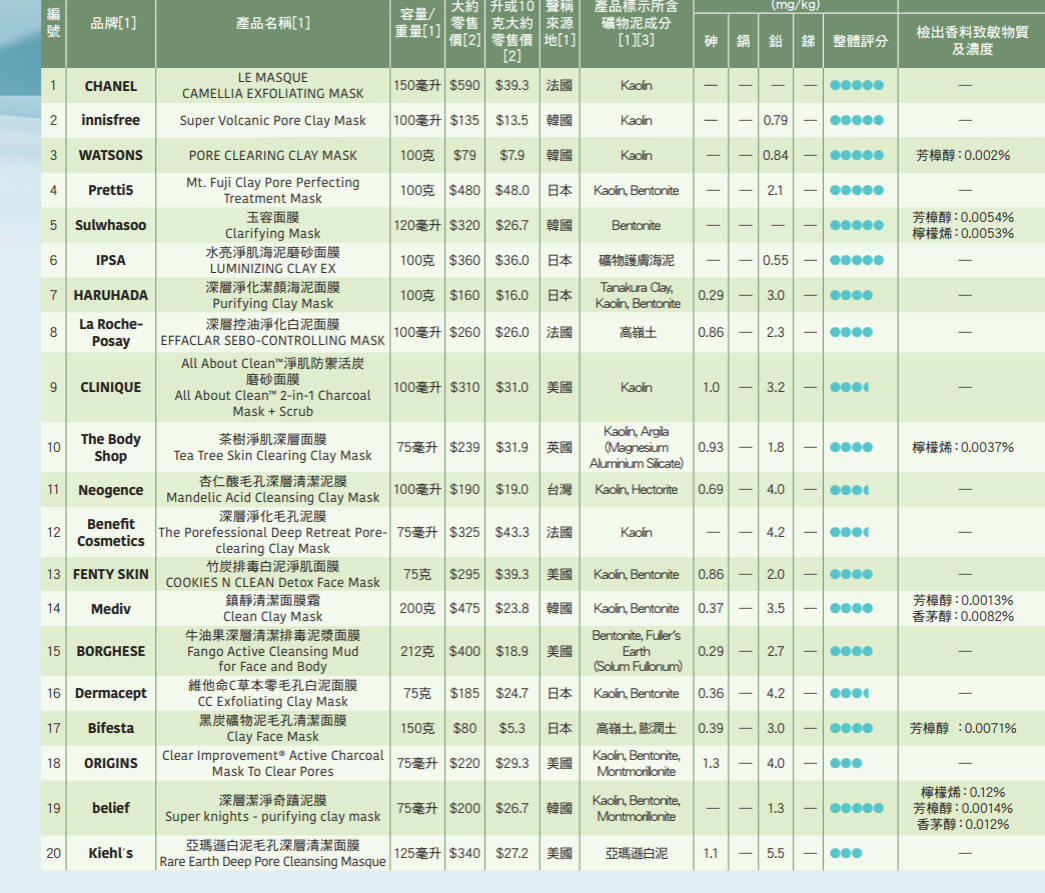 是次測試涵蓋30款以不同礦物泥為主要成分的泥狀清潔面膜,樣本主要購自百貨公司、化妝品牌專門店及連鎖個人護理用品店,售價由每瓶/支79元至610元,若按每10毫升或10克樣本計算,售價由5.3元至122元,相差22倍。測試項目參考歐盟、美國及內地等有關要求,涵蓋重金屬、香料致敏物質、水楊酸、防腐劑及微生物安全等項目,並檢視樣本的標籤資料。