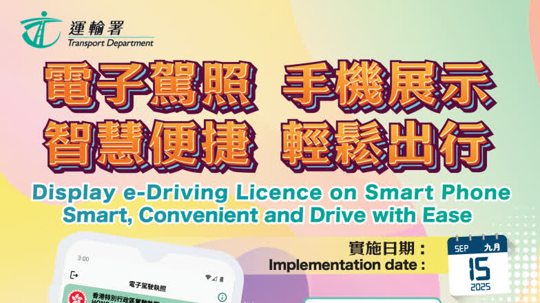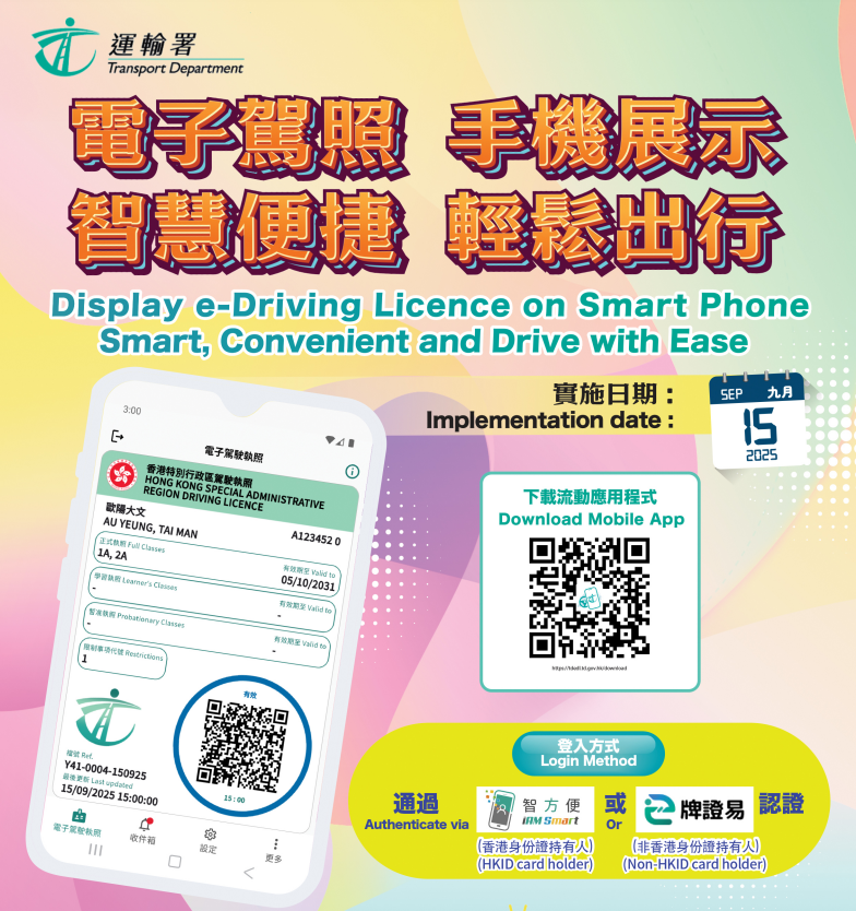 即日起,駕照持有人可免費下載運輸署「電子駕駛執照」流動應用程式,透過「智方便」(香港身份證持有人)或運輸署「牌證易」網上電子牌照平台(非香港身份證持有人)賬戶認證,登入讀取電子駕照,包括正式、學習、暫准和臨時駕照,以及駕駛教師執照。電子駕照可作為實體駕照以外的另一選擇,以符合攜帶或出示駕照以供執法人員檢查或查閱的法定要求。