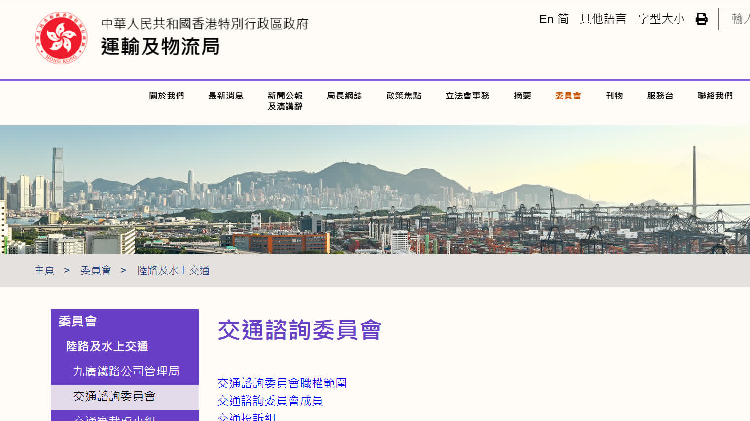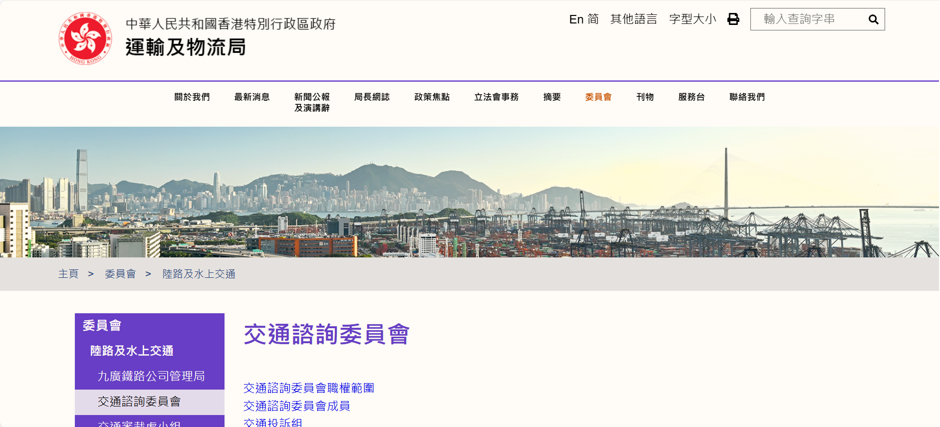 交諮會是重要的諮詢組織,就廣泛的運輸政策及重要交通措施向政府提供意見。委員會目前由16名非官方委員(包括主席)及3名官方代表組成。